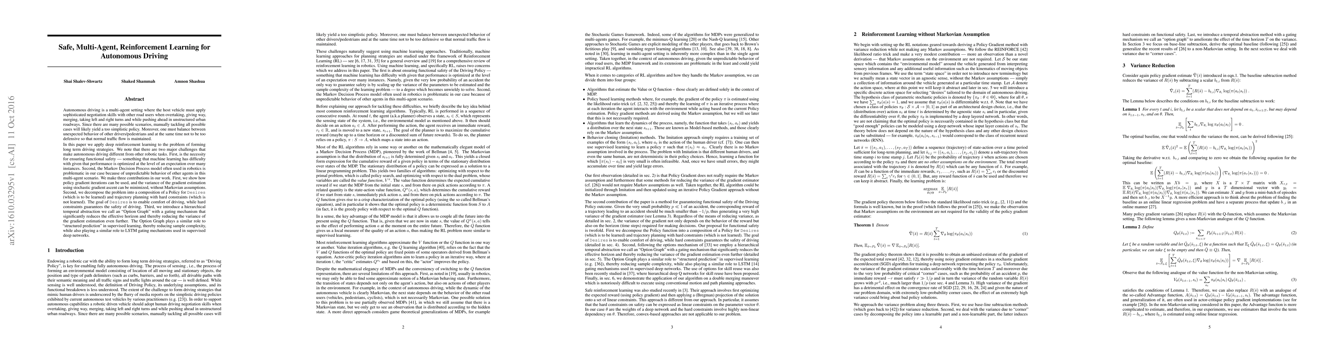 Autonomous driving is a multi-agent setting where the host vehicle must apply sophisticated negotiation skills with other road users when overtaking, giving way, merging, taking left and right turns and while pushing ahead in unstructured urban roadways. Since there are many possible scenarios, manually tackling all possible cases will likely yield a too simplistic policy. Moreover, one must balance between unexpected behavior of other drivers/pedestrians and at the same time not to be too defensive so that normal traffic flow is maintained. In this paper we apply deep reinforcement learning to the problem of forming long term driving strategies. We note that there are two major challenges that make autonomous driving different from other robotic tasks. First, is the necessity for ensuring functional safety - something that machine learning has difficulty with given that performance is optimized at the level of an expectation over many instances. Second, the Markov Decision Process model often used in robotics is problematic in our case because of unpredictable behavior of other agents in this multi-agent scenario. We make three contributions in our work. First, we show how policy gradient iterations can be used without Markovian assumptions. Second, we decompose the problem into a composition of a Policy for Desires (which is to be learned) and trajectory planning with hard constraints (which is not learned). The goal of Desires is to enable comfort of driving, while hard constraints guarantees the safety of driving. Third, we introduce a hierarchical temporal abstraction we call an "Option Graph" with a gating mechanism that significantly reduces the effective horizon and thereby reducing the variance of the gradient estimation even further.