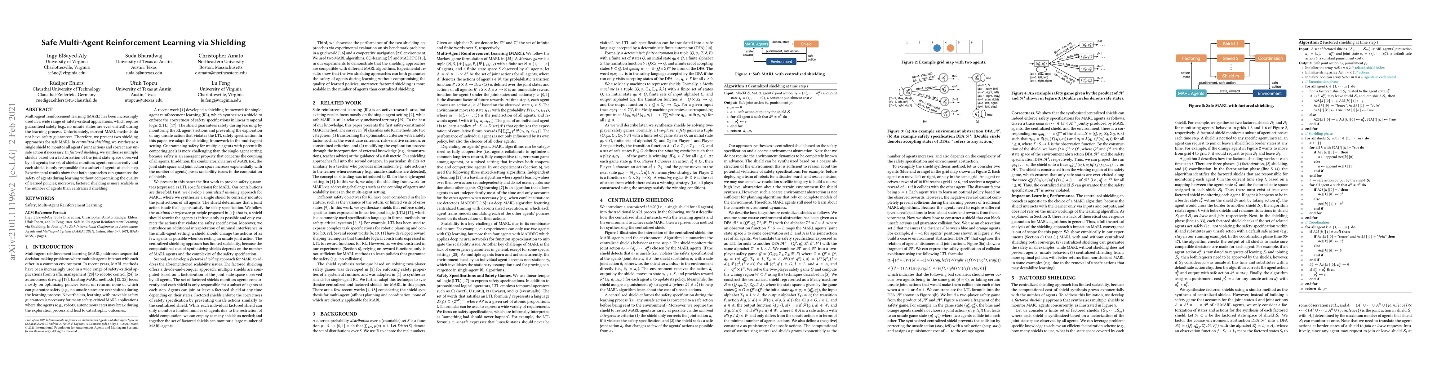 This paper proposes two shielding approaches for safe multi-agent reinforcement learning (MARL) to ensure no unsafe states are visited during the learning process. Centralized shielding monitors all agents' joint actions, while factored shielding divides the monitoring into subsets based on state space factorization, showing better scalability with more agents.