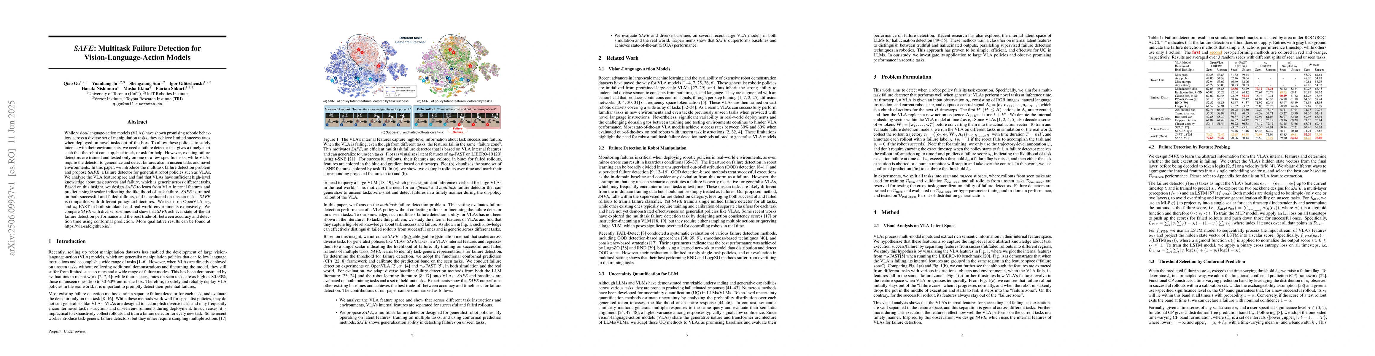 The paper introduces SAFE, a failure detector for vision-language-action models (VLAs) designed to generalize across various tasks and environments. SAFE leverages VLA internal features to predict task failure likelihood, outperforming baselines in accuracy and detection time, and is compatible with different policy architectures. It was tested on multiple platforms in both simulated and real-world settings.