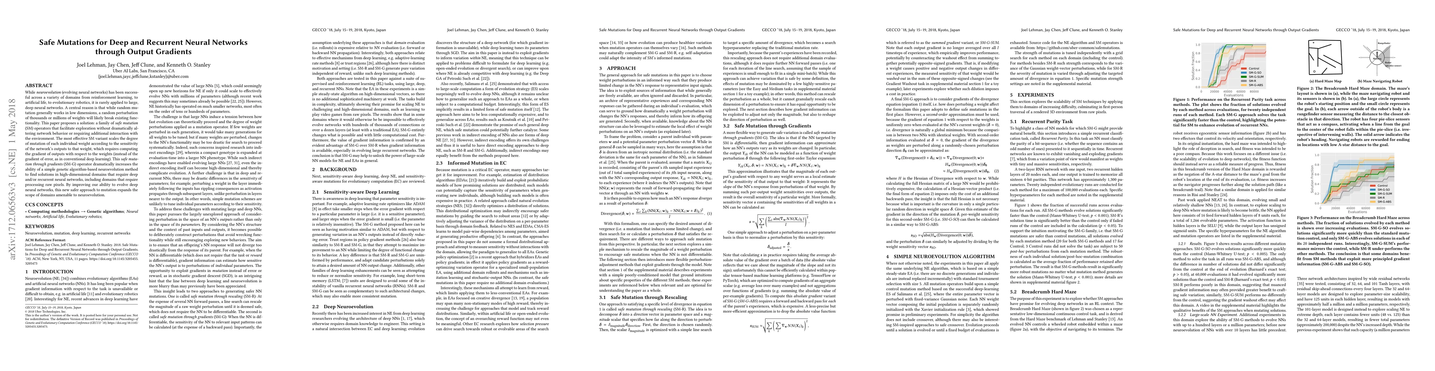 A new method called Safe Mutations for Deep Neural Networks through Output Gradients proposes a safer way to evolve large neural networks, increasing their ability to find solutions in complex domains. This approach uses gradients of network outputs to scale the degree of mutation, allowing it to explore high-dimensional domains without breaking existing functionality.