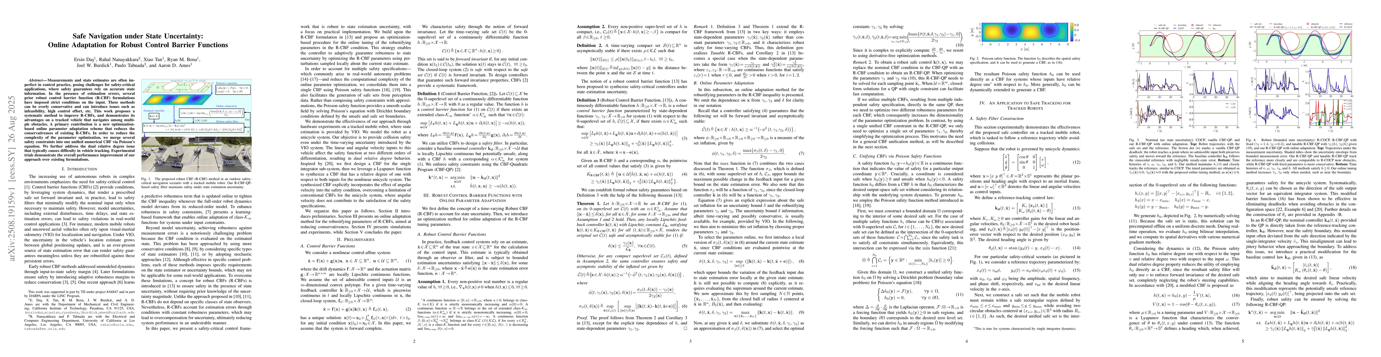 Measurements and state estimates are often imperfect in control practice, posing challenges for safety-critical applications, where safety guarantees rely on accurate state information. In the presence of estimation errors, several prior robust control barrier function (R-CBF) formulations have imposed strict conditions on the input. These methods can be overly conservative and can introduce issues such as infeasibility, high control effort, etc. This work proposes a systematic method to improve R-CBFs, and demonstrates its advantages on a tracked vehicle that navigates among multiple obstacles. A primary contribution is a new optimization-based online parameter adaptation scheme that reduces the conservativeness of existing R-CBFs. In order to reduce the complexity of the parameter optimization, we merge several safety constraints into one unified numerical CBF via Poisson's equation. We further address the dual relative degree issue that typically causes difficulty in vehicle tracking. Experimental trials demonstrate the overall performance improvement of our approach over existing formulations.