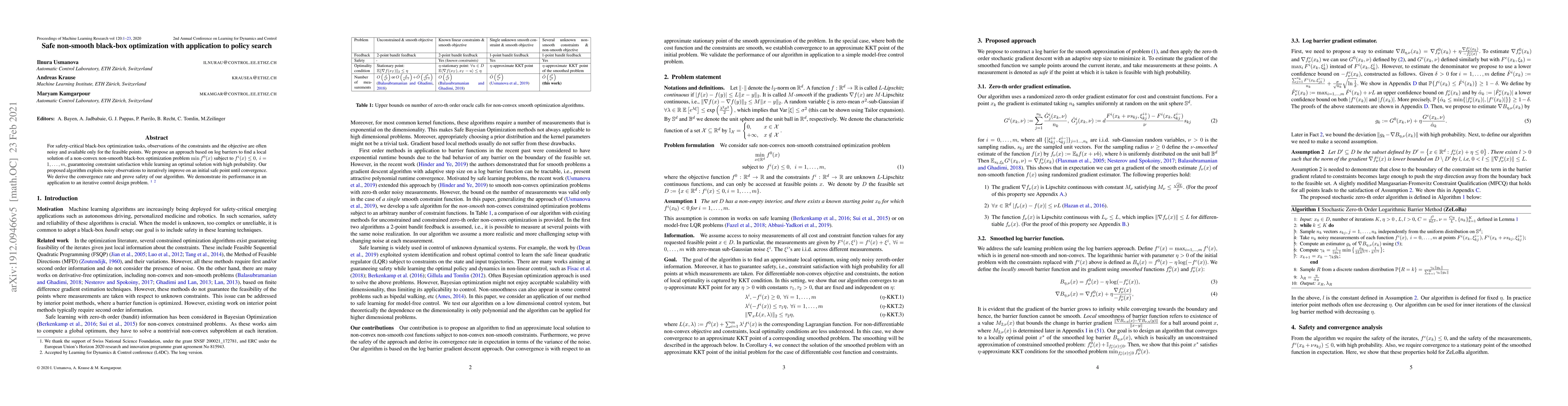 For safety-critical black-box optimization tasks, observations of the constraints and the objective are often noisy and available only for the feasible points. We propose an approach based on log barriers to find a local solution of a non-convex non-smooth black-box optimization problem $\min f^0(x)$ subject to $f^i(x)\leq 0,~ i = 1,\ldots, m$, at the same time, guaranteeing constraint satisfaction while learning an optimal solution with high probability. Our proposed algorithm exploits noisy observations to iteratively improve on an initial safe point until convergence. We derive the convergence rate and prove safety of our algorithm. We demonstrate its performance in an application to an iterative control design problem.