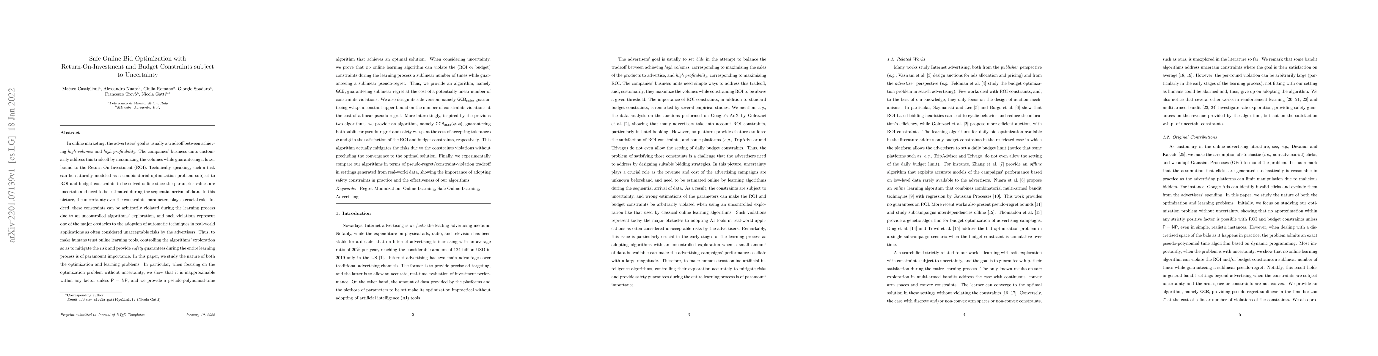 In online marketing, the advertisers' goal is usually a tradeoff between achieving high volumes and high profitability. The companies' business units customarily address this tradeoff by maximizing the volumes while guaranteeing a lower bound to the Return On Investment (ROI). This paper investigates combinatorial bandit algorithms for the bid optimization of advertising campaigns subject to uncertain budget and ROI constraints. We study the nature of both the optimization and learning problems. In particular, when focusing on the optimization problem without uncertainty, we show that it is inapproximable within any factor unless P=NP, and we provide a pseudo-polynomial-time algorithm that achieves an optimal solution. When considering uncertainty, we prove that no online learning algorithm can violate the (ROI or budget) constraints during the learning process a sublinear number of times while guaranteeing a sublinear pseudo-regret. Thus, we provide an algorithm, namely GCB, guaranteeing sublinear regret at the cost of a potentially linear number of constraints violations. We also design its safe version, namely GCB_{safe}, guaranteeing w.h.p. a constant upper bound on the number of constraints violations at the cost of a linear pseudo-regret. More interestingly, we provide an algorithm, namely GCB_{safe}(\psi,\phi), guaranteeing both sublinear pseudo-regret and safety w.h.p. at the cost of accepting tolerances \psi and \phi in the satisfaction of the ROI and budget constraints, respectively. This algorithm actually mitigates the risks due to the constraints violations without precluding the convergence to the optimal solution. Finally, we experimentally compare our algorithms in terms of pseudo-regret/constraint-violation tradeoff in settings generated from real-world data, showing the importance of adopting safety constraints in practice and the effectiveness of our algorithms.