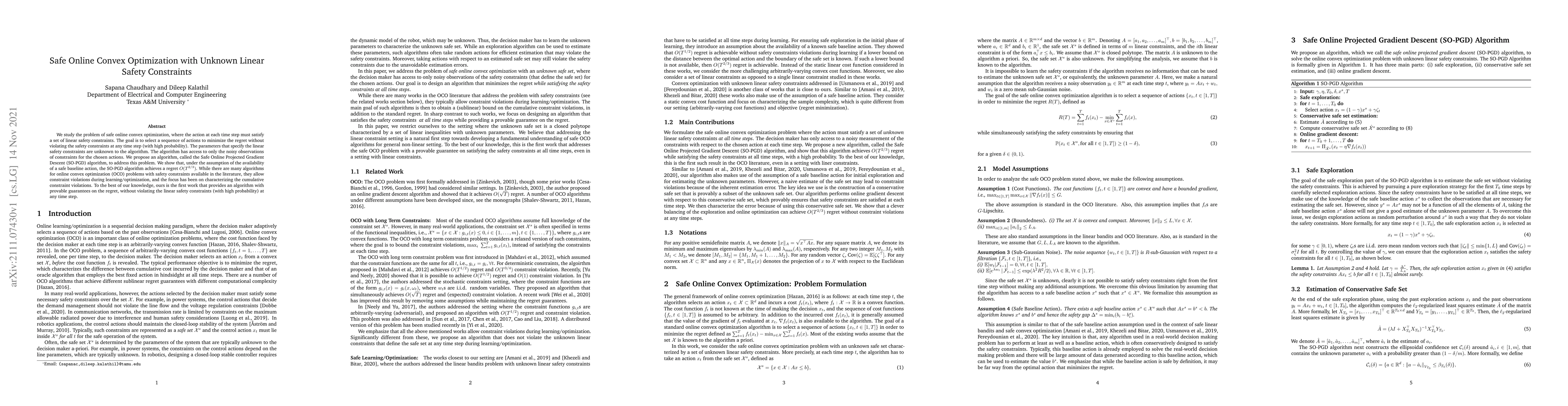 This paper introduces the Safe Online Projected Gradient Descent (SO-PGD) algorithm for safe online convex optimization under unknown linear safety constraints. It achieves a regret of $O(T^{2/3})$ without violating the constraints at any time step, providing the first algorithm with such guarantees.