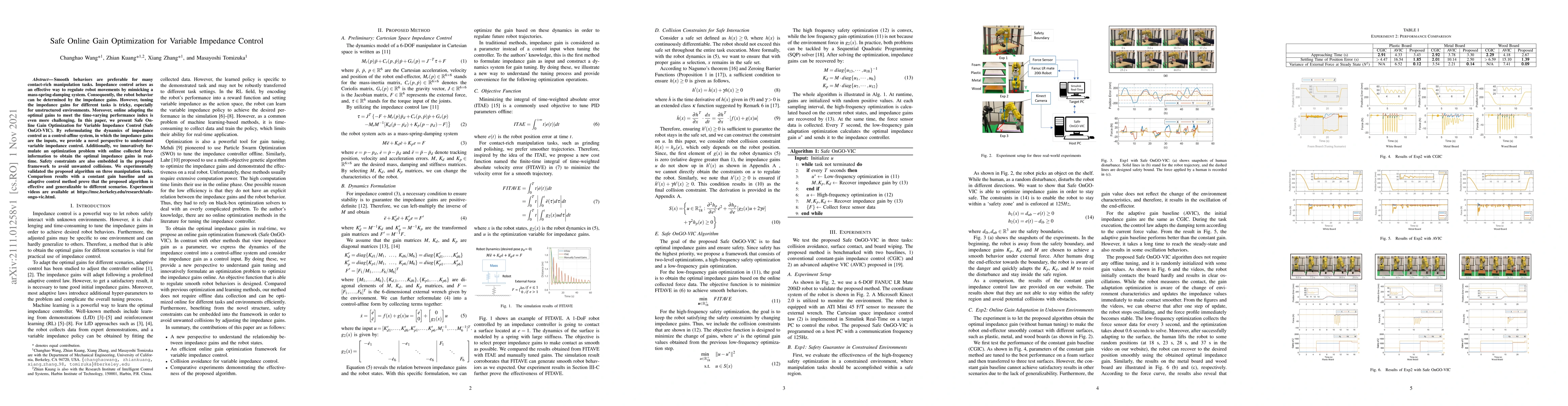 This paper introduces Safe Online Gain Optimization for Variable Impedance Control (Safe OnGO-VIC), which reformulates impedance control dynamics to adaptively optimize gains in real-time, ensuring safety through embedded constraints, and demonstrates effectiveness across various manipulation tasks.