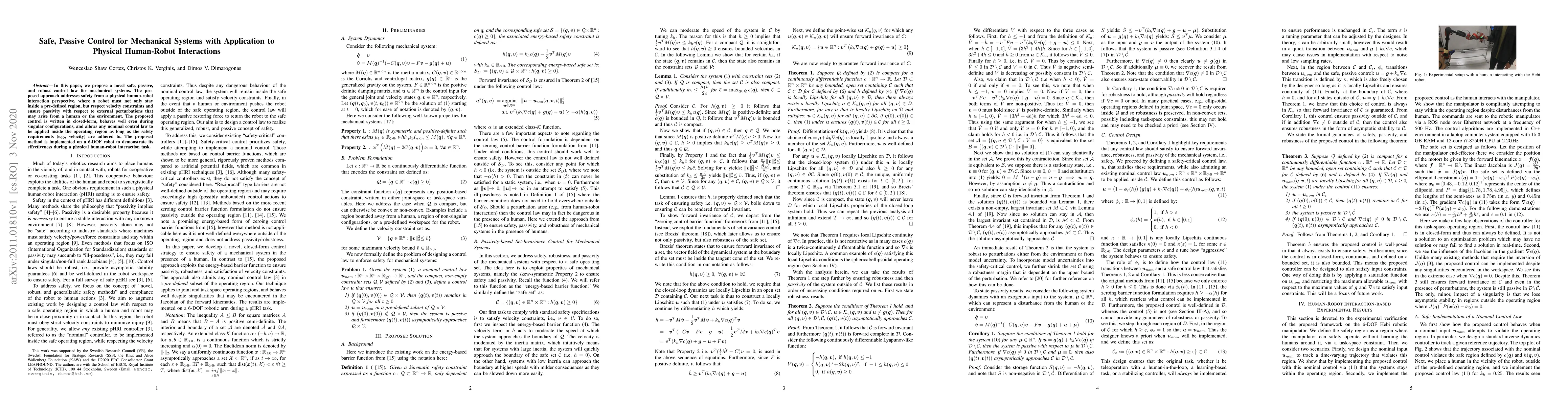 This paper introduces a safe, passive control law for mechanical systems, particularly for human-robot interactions, ensuring the robot respects predefined safety regions and velocity constraints while maintaining passivity. The method is demonstrated on a 6-DOF robot during a human-robot interaction task.
