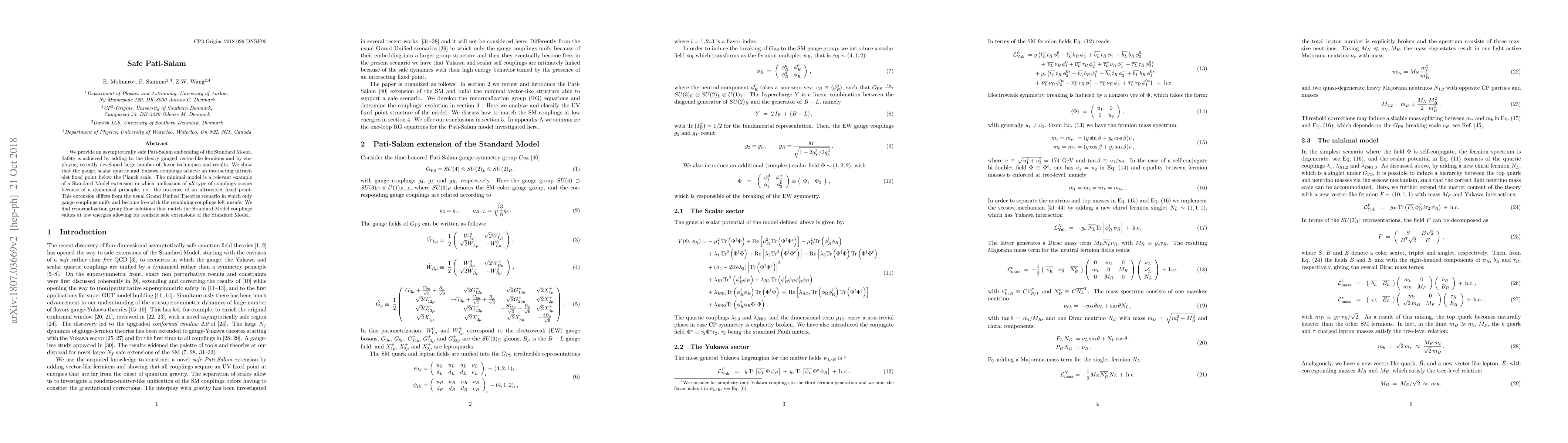 We provide an asymptotically safe Pati-Salam embedding of the Standard Model. Safety is achieved by adding to the theory gauged vector-like fermions and by employing recently developed large number-of-flavor techniques and results. We show that the gauge, scalar quartic and Yukawa couplings achieve an interacting ultraviolet fixed point below the Planck scale. The minimal model is a relevant example of a Standard Model extension in which unification of all type of couplings occurs because of a dynamical principle, i.e. the presence of an ultraviolet fixed point. This extension differs from the usual Grand Unified Theories scenario in which only gauge couplings unify and become free with the remaining couplings left unsafe. We find renormalization group flow solutions that match the Standard Model couplings values at low energies allowing for realistic safe extensions of the Standard Model.