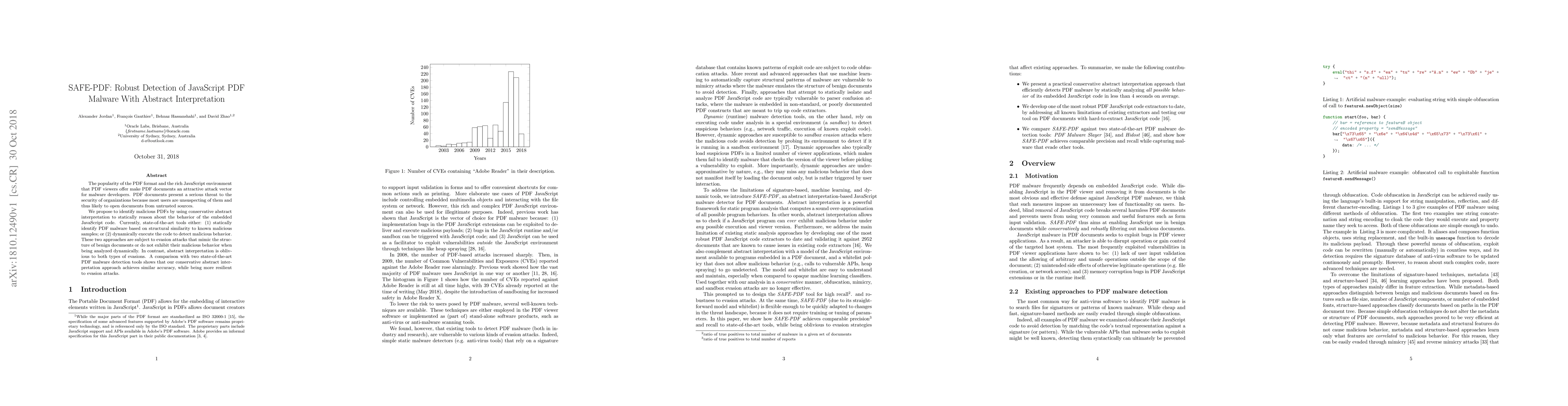 SAFE-PDF employs conservative abstract interpretation to robustly detect JavaScript malware in PDF documents, offering a static analysis method that is resilient to evasion attacks, unlike traditional dynamic execution or structural similarity-based detection methods. The approach achieves comparable accuracy while providing enhanced security against sophisticated malware.