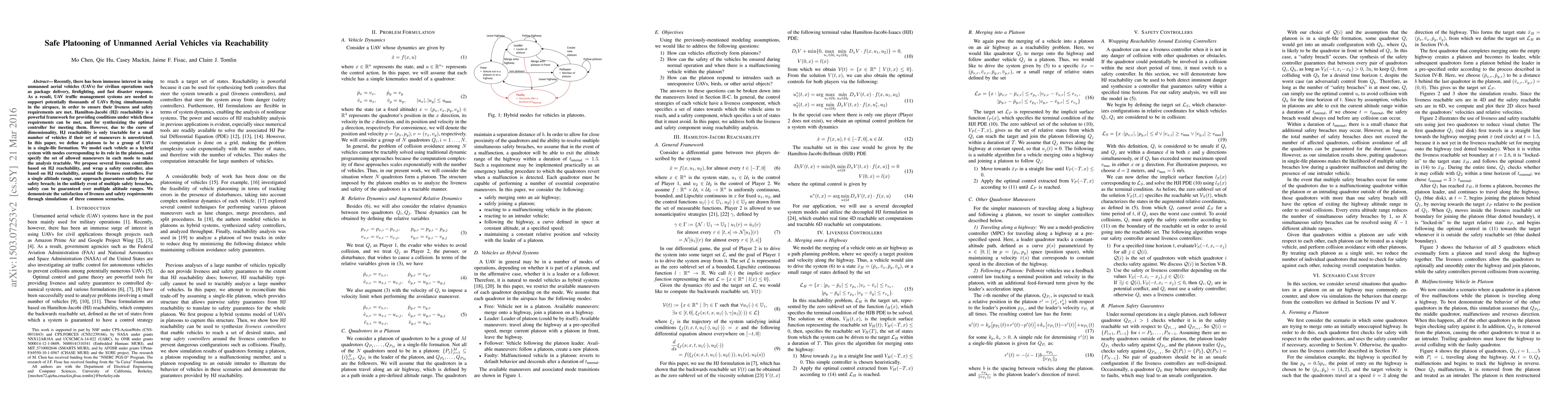 This paper proposes a framework for safe platooning of unmanned aerial vehicles (UAVs) using Hamilton-Jacobi reachability, addressing the challenge of managing large numbers of UAVs simultaneously while ensuring safety and liveness. The approach models UAVs as hybrid systems with restricted maneuvers, enabling the synthesis of liveness and safety controllers.