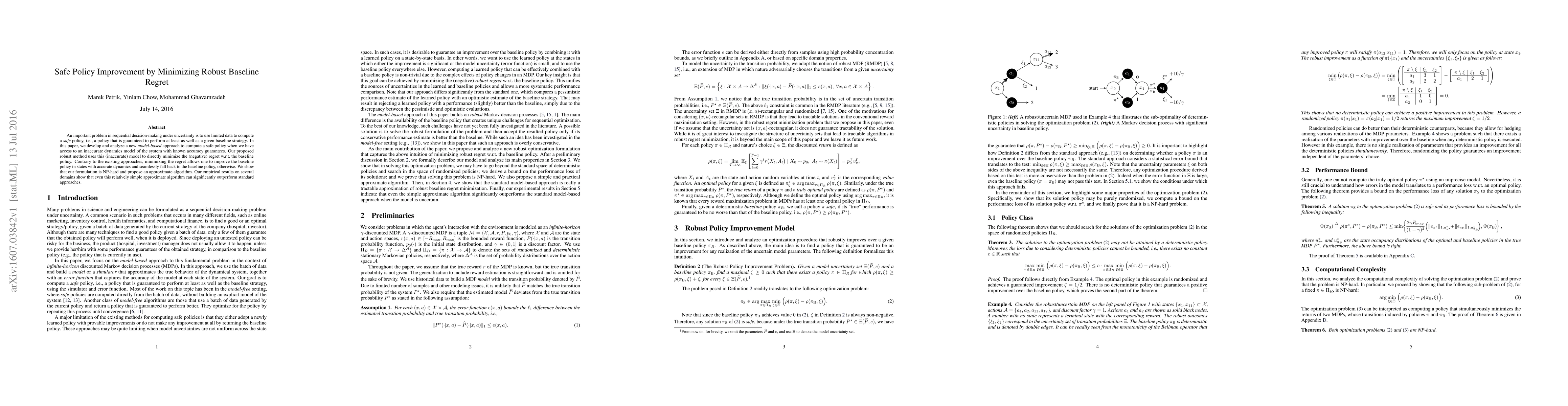 An important problem in sequential decision-making under uncertainty is to use limited data to compute a safe policy, i.e., a policy that is guaranteed to perform at least as well as a given baseline strategy. In this paper, we develop and analyze a new model-based approach to compute a safe policy when we have access to an inaccurate dynamics model of the system with known accuracy guarantees. Our proposed robust method uses this (inaccurate) model to directly minimize the (negative) regret w.r.t. the baseline policy. Contrary to the existing approaches, minimizing the regret allows one to improve the baseline policy in states with accurate dynamics and seamlessly fall back to the baseline policy, otherwise. We show that our formulation is NP-hard and propose an approximate algorithm. Our empirical results on several domains show that even this relatively simple approximate algorithm can significantly outperform standard approaches.