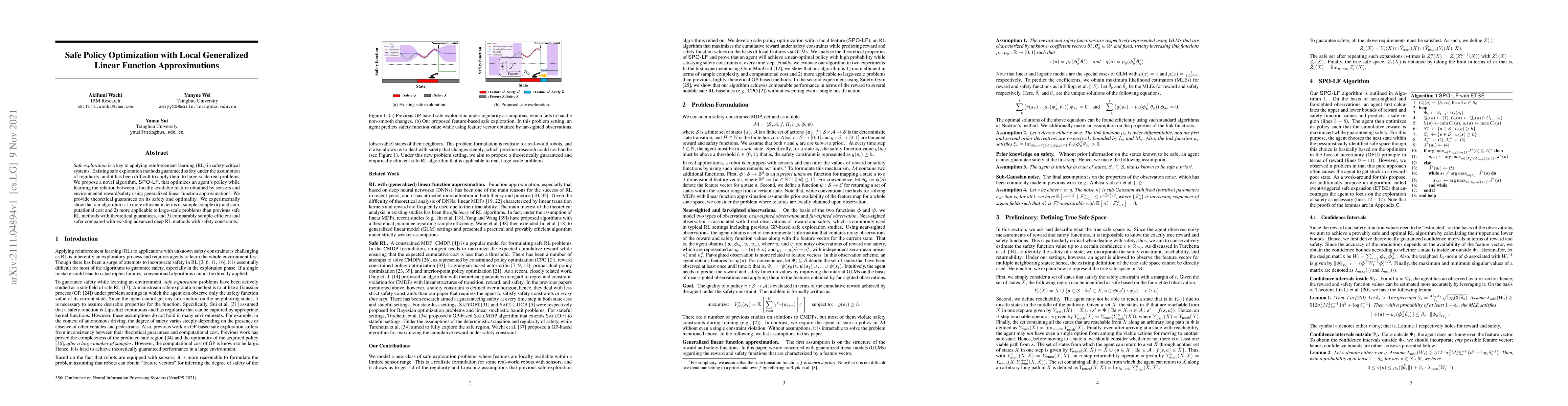 Safe exploration is a key to applying reinforcement learning (RL) in safety-critical systems. Existing safe exploration methods guaranteed safety under the assumption of regularity, and it has been difficult to apply them to large-scale real problems. We propose a novel algorithm, SPO-LF, that optimizes an agent's policy while learning the relation between a locally available feature obtained by sensors and environmental reward/safety using generalized linear function approximations. We provide theoretical guarantees on its safety and optimality. We experimentally show that our algorithm is 1) more efficient in terms of sample complexity and computational cost and 2) more applicable to large-scale problems than previous safe RL methods with theoretical guarantees, and 3) comparably sample-efficient and safer compared with existing advanced deep RL methods with safety constraints.