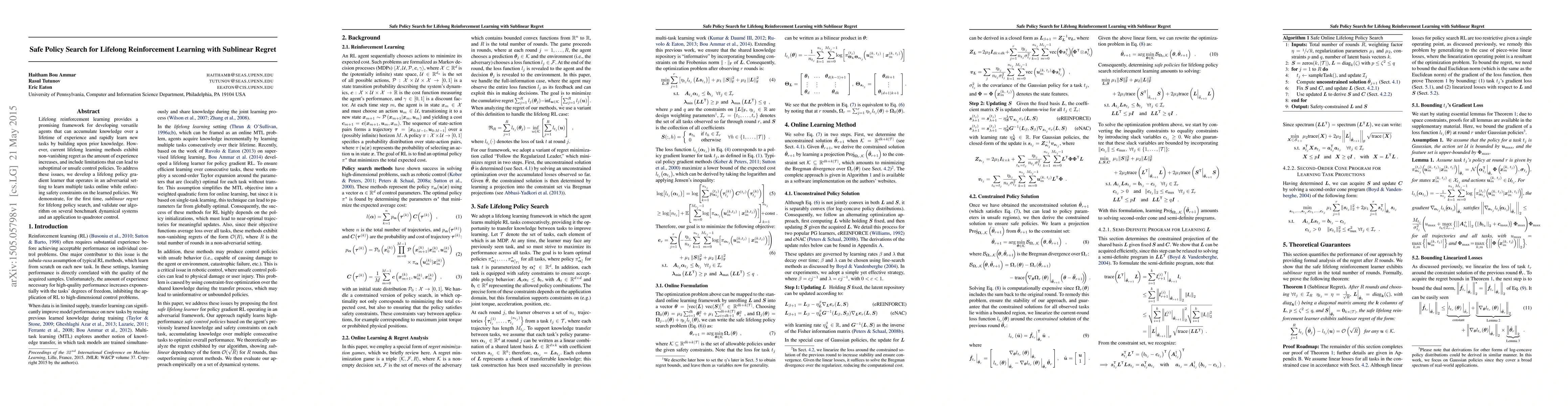This paper proposes a lifelong reinforcement learning method that enforces safety constraints to develop versatile agents capable of accumulating knowledge over time and learning new tasks efficiently. The developed algorithm achieves sublinear regret and is validated on benchmark systems and quadrotor control.