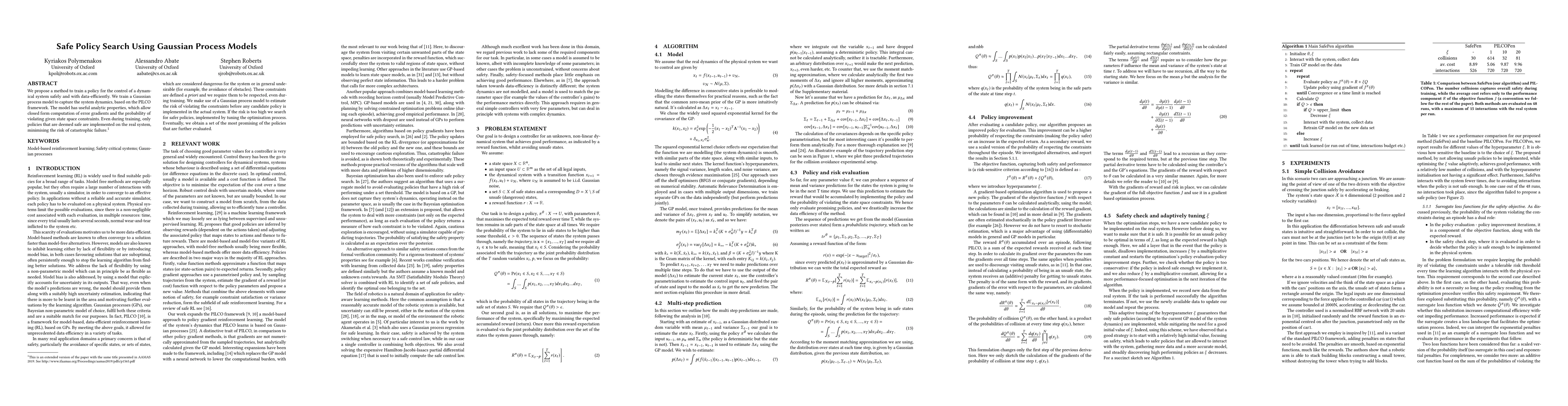 This paper proposes a method to safely optimize policy parameters using Gaussian process models, minimizing risk of failure during task execution. It trains a model to capture system dynamics while ensuring only safe policies are implemented on the real system.