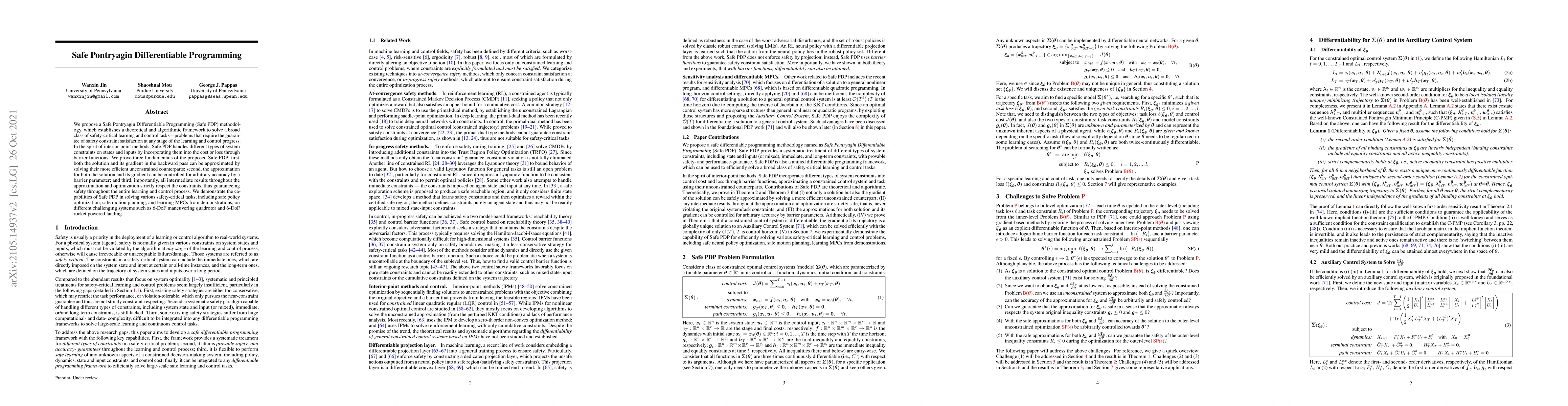 The paper introduces Safe Pontryagin Differentiable Programming (Safe PDP), a framework for solving safety-critical learning and control tasks by incorporating safety constraints through barrier functions. It guarantees safety by ensuring all intermediate results respect constraints, demonstrated through applications like safe policy optimization and motion planning.