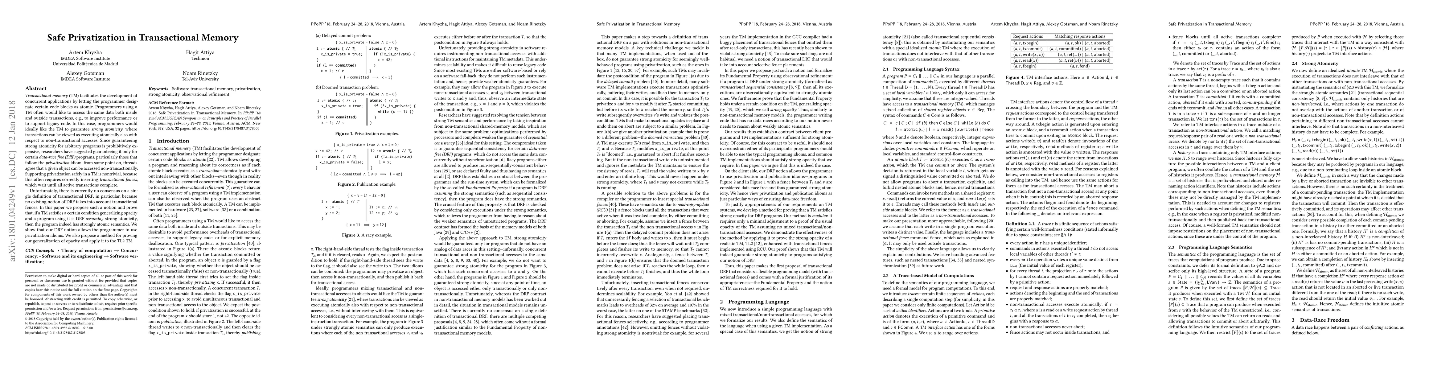 This paper proposes a new definition of data-race-free (DRF) programs that accounts for transactional fences, enabling safe privatization in transactional memory (TM). It proves that if a TM satisfies a generalized condition and a program is DRF under this definition, the program will have strongly atomic semantics, thus supporting the privatization idiom effectively.