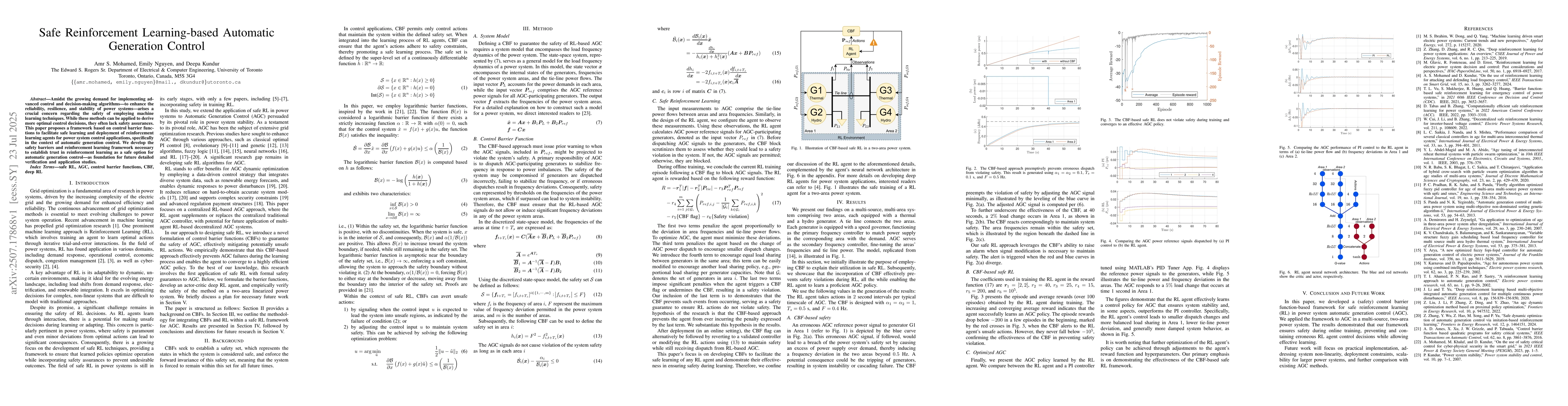 The paper proposes a framework for safe reinforcement learning (RL) in power system automatic generation control (AGC) using control barrier functions (CBFs). This framework ensures safety during online training, preventing and containing erroneous RL agent control decisions while allowing effective learning.