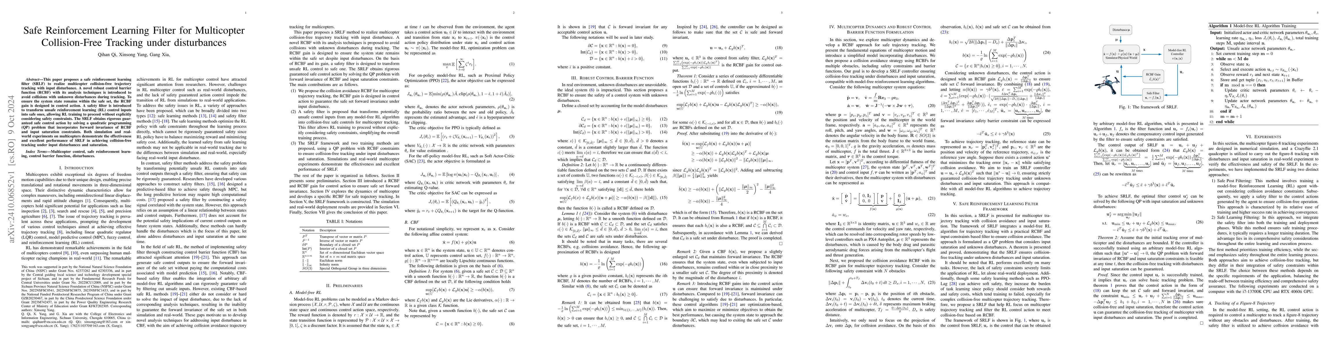 This paper introduces a Safe Reinforcement Learning Filter (SRLF) to enable multicopters to track collision-free trajectories under input disturbances. It employs a robust control barrier function (RCBF) to ensure safety, transforming unsafe RL inputs into safe ones, validated through both simulation and real-world experiments.