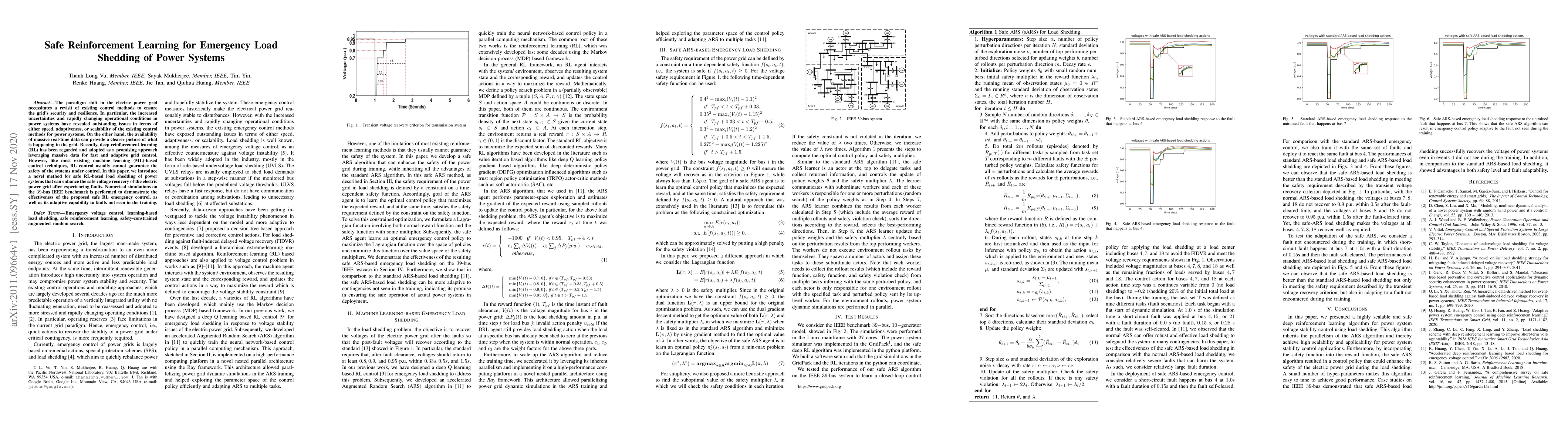 The paradigm shift in the electric power grid necessitates a revisit of existing control methods to ensure the grid's security and resilience. In particular, the increased uncertainties and rapidly changing operational conditions in power systems have revealed outstanding issues in terms of either speed, adaptiveness, or scalability of the existing control methods for power systems. On the other hand, the availability of massive real-time data can provide a clearer picture of what is happening in the grid. Recently, deep reinforcement learning(RL) has been regarded and adopted as a promising approach leveraging massive data for fast and adaptive grid control. However, like most existing machine learning (ML)-basedcontrol techniques, RL control usually cannot guarantee the safety of the systems under control. In this paper, we introduce a novel method for safe RL-based load shedding of power systems that can enhance the safe voltage recovery of the electric power grid after experiencing faults. Numerical simulations on the 39-bus IEEE benchmark is performed to demonstrate the effectiveness of the proposed safe RL emergency control, as well as its adaptive capability to faults not seen in the training.