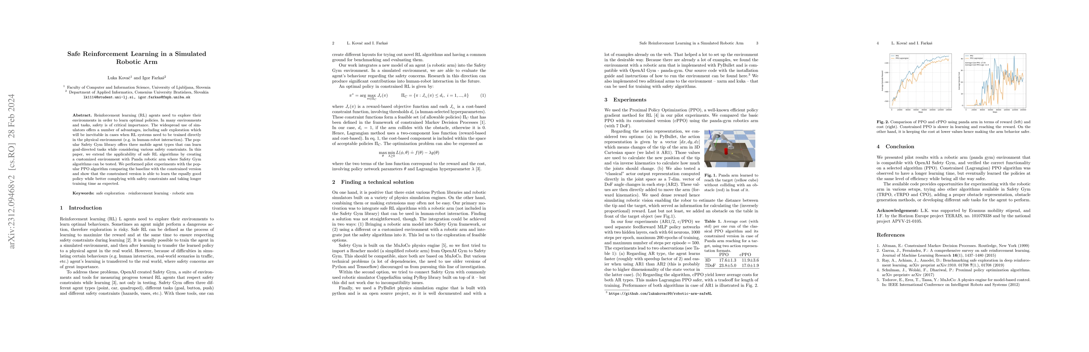 This paper explores safe reinforcement learning (RL) with a focus on a simulated Panda robotic arm environment. It introduces a customized environment for testing safe RL algorithms from the Safety Gym library, demonstrating that constrained versions of RL algorithms, like PPO, can achieve optimal policies while adhering to safety constraints, albeit with longer training times.