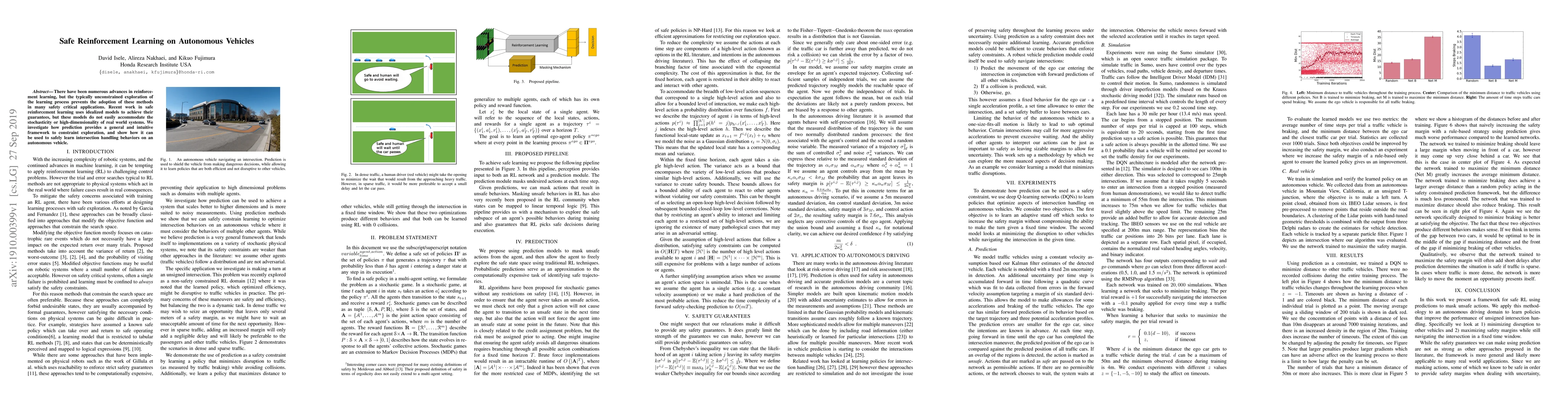 This paper explores safe reinforcement learning for autonomous vehicles by using prediction to constrain exploration, addressing the challenges of real-world stochasticity and high-dimensionality, and demonstrates its effectiveness in learning intersection handling behaviors.