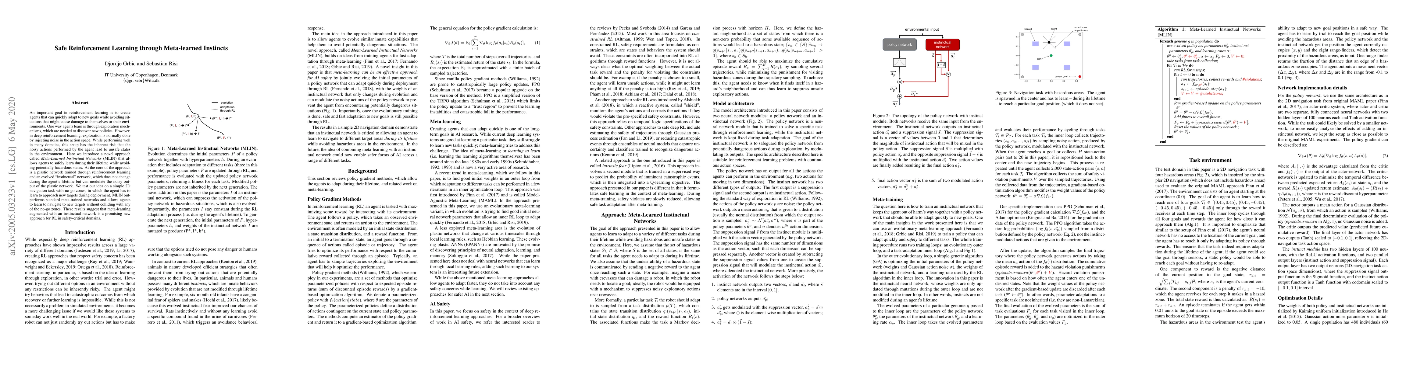 This paper proposes Meta-Learned Instinctual Networks (MLIN) to enable safe reinforcement learning by combining a plastic network with an evolved instinctual network that modulates noisy actions to avoid hazardous states. MLIN successfully allows agents to navigate to new targets in a 2D environment without encountering no-go zones, demonstrating a promising approach for safe AI.