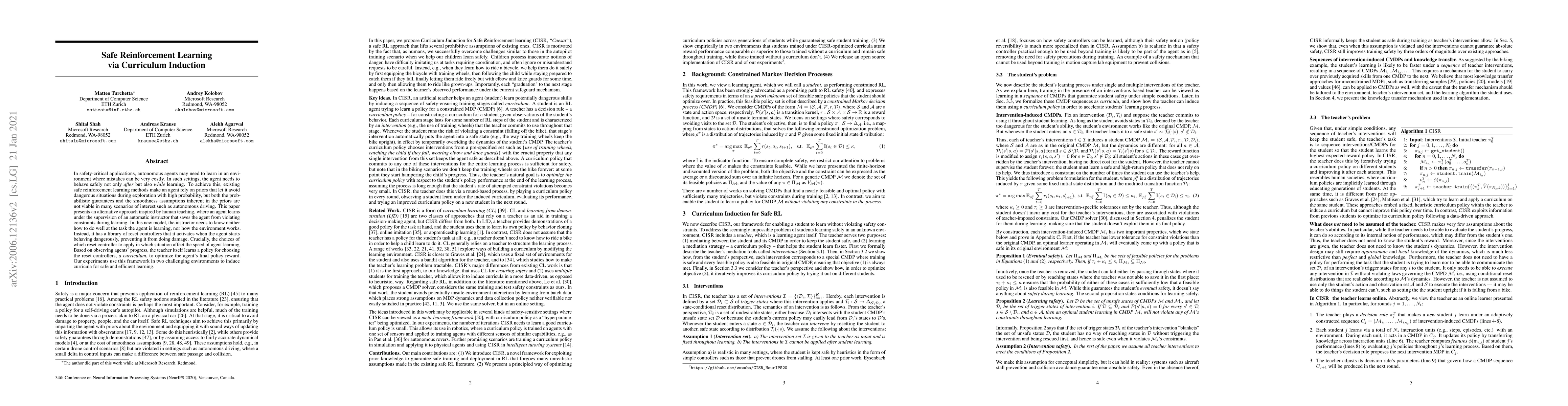In safety-critical applications, autonomous agents may need to learn in an environment where mistakes can be very costly. In such settings, the agent needs to behave safely not only after but also while learning. To achieve this, existing safe reinforcement learning methods make an agent rely on priors that let it avoid dangerous situations during exploration with high probability, but both the probabilistic guarantees and the smoothness assumptions inherent in the priors are not viable in many scenarios of interest such as autonomous driving. This paper presents an alternative approach inspired by human teaching, where an agent learns under the supervision of an automatic instructor that saves the agent from violating constraints during learning. In this model, we introduce the monitor that neither needs to know how to do well at the task the agent is learning nor needs to know how the environment works. Instead, it has a library of reset controllers that it activates when the agent starts behaving dangerously, preventing it from doing damage. Crucially, the choices of which reset controller to apply in which situation affect the speed of agent learning. Based on observing agents' progress, the teacher itself learns a policy for choosing the reset controllers, a curriculum, to optimize the agent's final policy reward. Our experiments use this framework in two environments to induce curricula for safe and efficient learning.