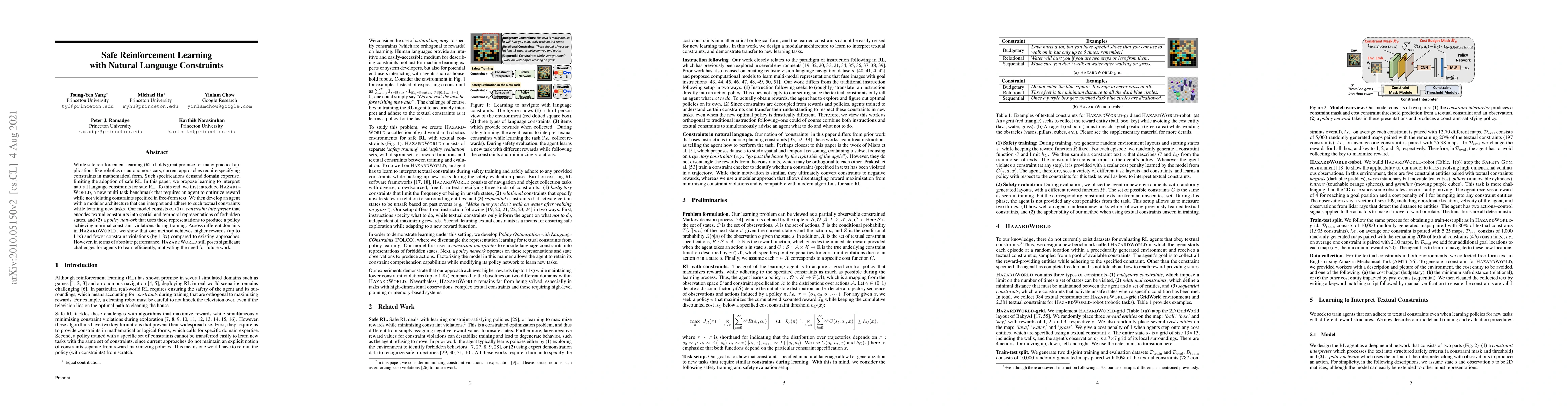 This paper proposes a method for safe reinforcement learning that interprets natural language constraints, addressing the need for domain expertise in current mathematical approaches. The authors introduce HazardWorld, a benchmark for testing agents that must optimize rewards while adhering to textual constraints, and demonstrate their modular agent achieves higher rewards and fewer constraint violations compared to existing methods.
