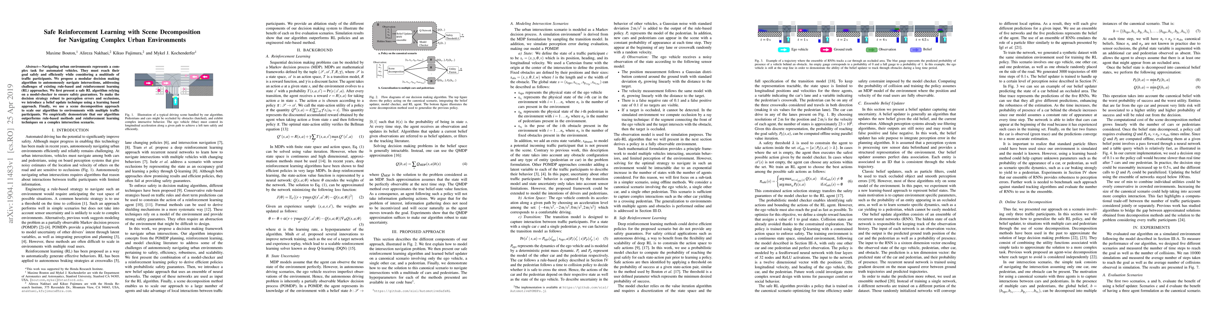 This paper proposes a modular reinforcement learning algorithm for safely navigating urban intersections, combining safety guarantees via model-checking, belief updates for robustness, and scene decomposition to handle multiple traffic participants, outperforming existing rule-based and RL methods in complex scenarios.
