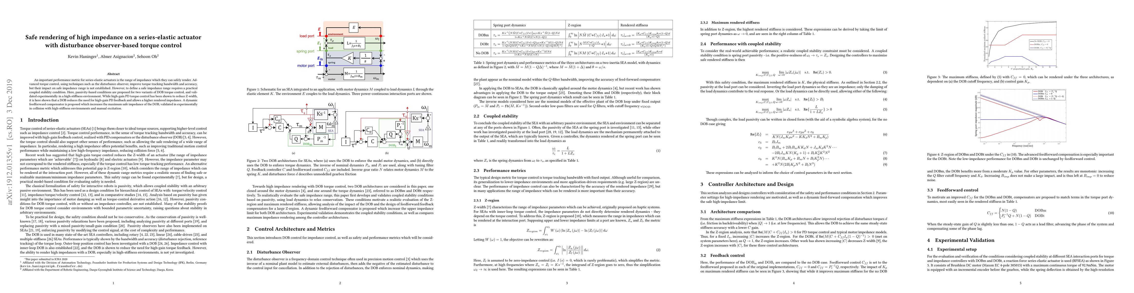 An important performance metric for series-elastic actuators is the range of impedance which they can safely render. Advanced torque control, using techniques such as the disturbance observer, improve torque tracking bandwidth and accuracy, but their impact on safe impedance range is not established. However, to define a safe impedance range requires a practical coupled stability condition. Here, passivity-based conditions are proposed for two variants of DOB torque control, and validated experimentally in a high-stiffness environment. While high-gain PD torque control has been shown to reduce Z-width, it is here shown that a DOB reduces the need for high-gain PD feedback and allows a higher rendered impedance. A dynamic feedforward compensator is proposed which increases the maximum safe impedance of the DOB, validated in experimentally in collision with high-stiffness environments and manual excitation.