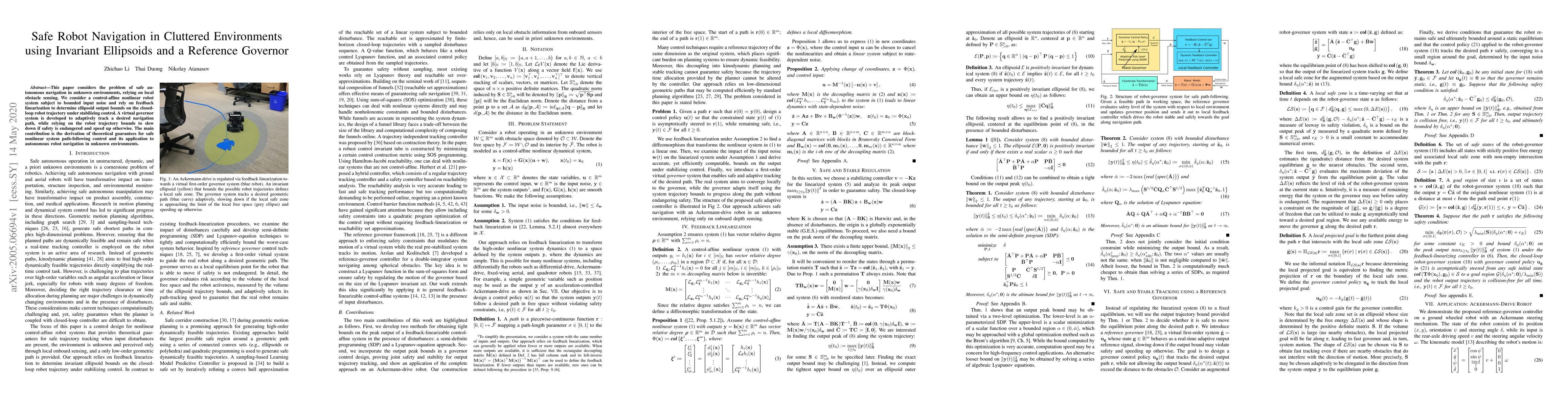 This paper proposes a method for safe autonomous robot navigation in cluttered, unknown environments using invariant ellipsoids and a reference governor to adaptively control the robot's speed based on trajectory bounds, ensuring safety while following a desired path. The key contribution is the theoretical guarantee for safe path-following control in nonlinear systems.