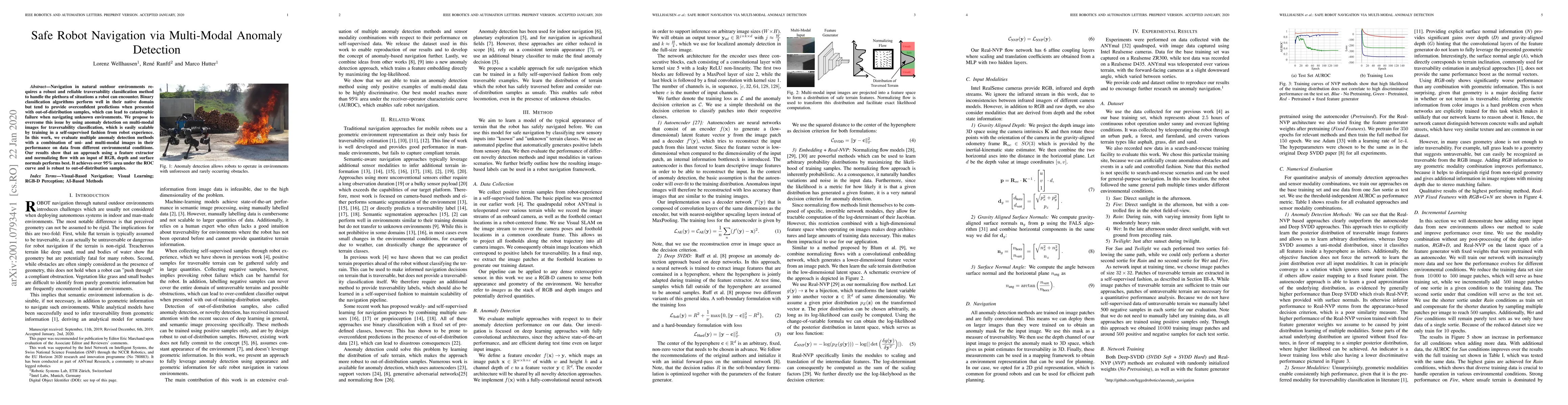 This paper proposes a method for safe robot navigation using multi-modal anomaly detection for traversability classification. It finds that combining RGB, depth, and surface normals with a feature extractor and normalizing flow achieves over 95% accuracy and robustness against out-of-distribution samples.