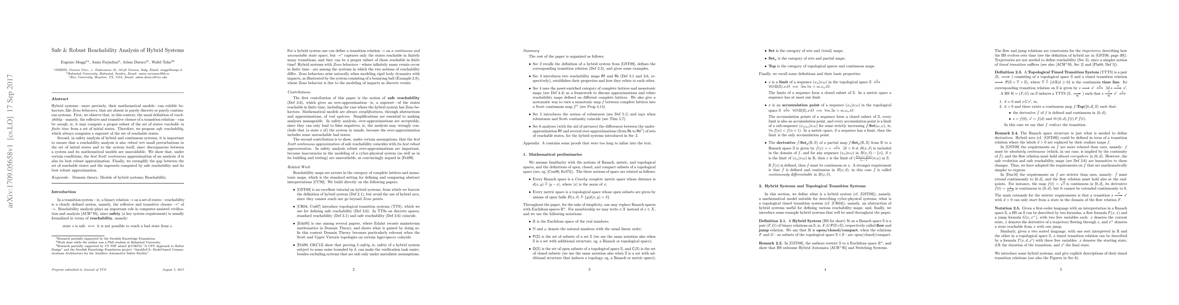 Hybrid systems - more precisely, their mathematical models - can exhibit behaviors, like Zeno behaviors, that are absent in purely discrete or purely continuous systems. First, we observe that, in this context, the usual definition of reachability - namely, the reflexive and transitive closure of a transition relation - can be unsafe, ie, it may compute a proper subset of the set of states reachable in finite time from a set of initial states. Therefore, we propose safe reachability, which always computes a superset of the set of reachable states. Second, in safety analysis of hybrid and continuous systems, it is important to ensure that a reachability analysis is also robust wrt small perturbations to the set of initial states and to the system itself, since discrepancies between a system and its mathematical models are unavoidable. We show that, under certain conditions, the best Scott continuous approximation of an analysis A is also its best robust approximation. Finally, we exemplify the gap between the set of reachable states and the supersets computed by safe reachability and its best robust approximation.