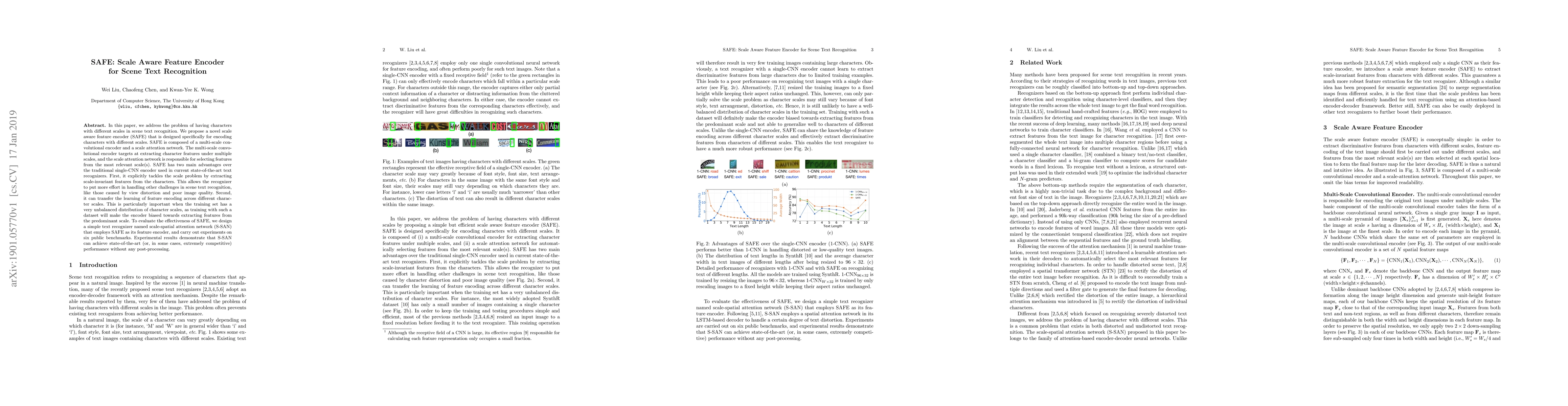 The paper proposes SAFE, a scale aware feature encoder for scene text recognition, which uses a multi-scale convolutional encoder and a scale attention network to extract and select relevant features from different character scales. SAFE improves recognition performance by addressing scale variance and enabling feature transfer across scales, leading to competitive results on six public benchmarks.