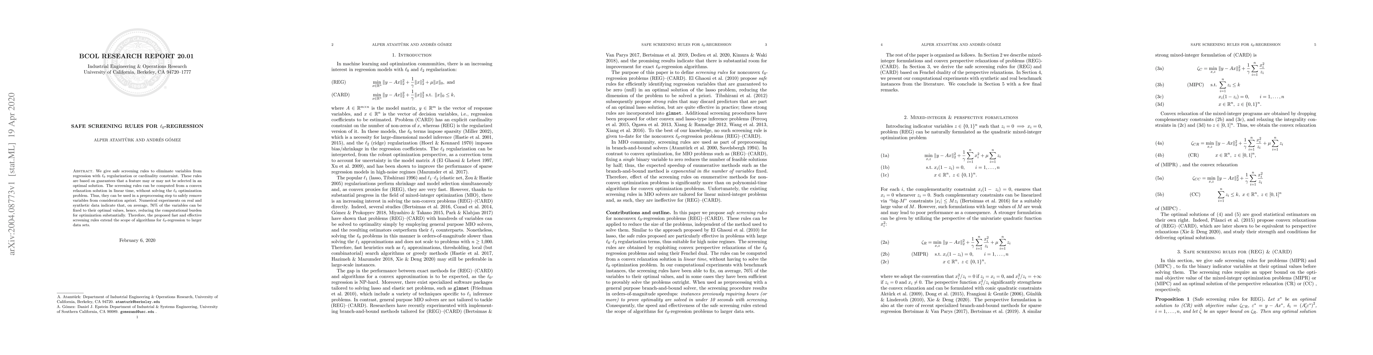 We give safe screening rules to eliminate variables from regression with $\ell_0$ regularization or cardinality constraint. These rules are based on guarantees that a feature may or may not be selected in an optimal solution. The screening rules can be computed from a convex relaxation solution in linear time, without solving the $\ell_0$ optimization problem. Thus, they can be used in a preprocessing step to safely remove variables from consideration apriori. Numerical experiments on real and synthetic data indicate that, on average, 76\% of the variables can be fixed to their optimal values, hence, reducing the computational burden for optimization substantially. Therefore, the proposed fast and effective screening rules extend the scope of algorithms for $\ell_0$-regression to larger data sets.