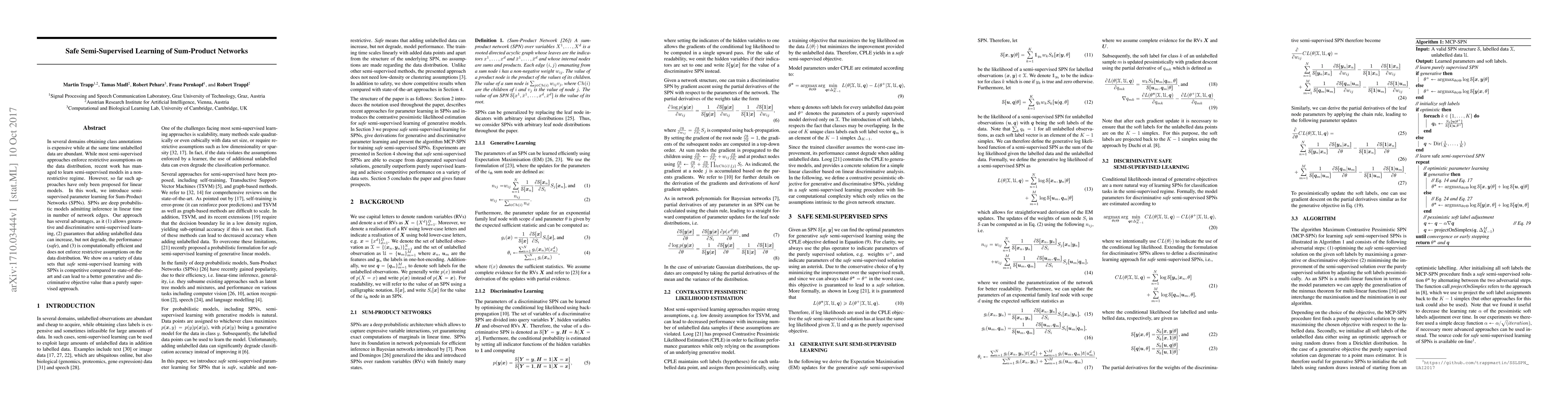 This paper introduces a novel semi-supervised learning method for Sum-Product Networks (SPNs), enabling generative and discriminative learning without restrictive assumptions. It guarantees that adding unlabelled data will not degrade performance, making it a "safe" approach.