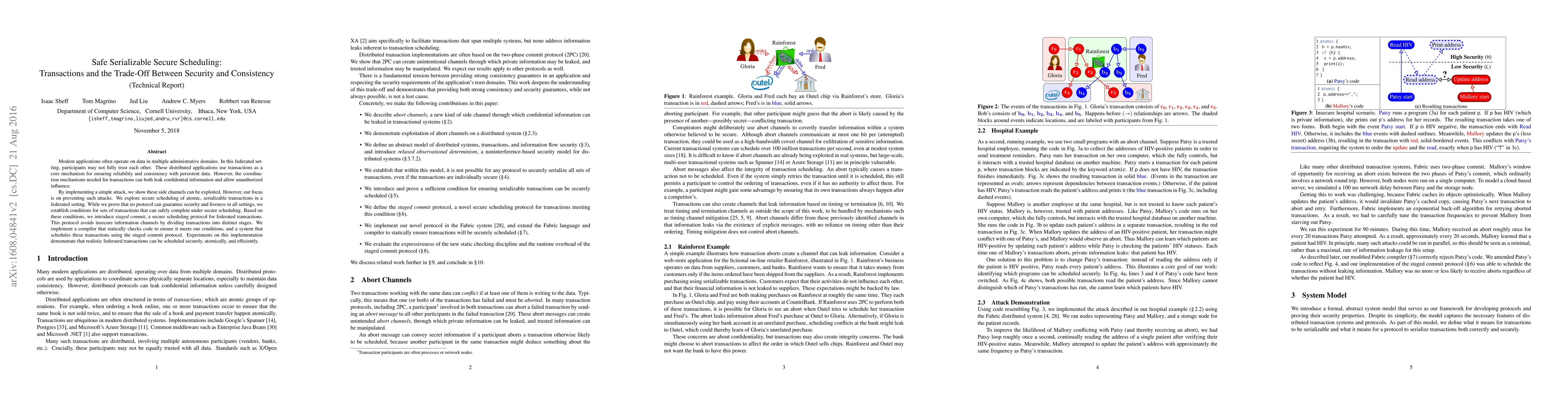 Modern applications often operate on data in multiple administrative domains. In this federated setting, participants may not fully trust each other. These distributed applications use transactions as a core mechanism for ensuring reliability and consistency with persistent data. However, the coordination mechanisms needed for transactions can both leak confidential information and allow unauthorized influence. By implementing a simple attack, we show these side channels can be exploited. However, our focus is on preventing such attacks. We explore secure scheduling of atomic, serializable transactions in a federated setting. While we prove that no protocol can guarantee security and liveness in all settings, we establish conditions for sets of transactions that can safely complete under secure scheduling. Based on these conditions, we introduce staged commit, a secure scheduling protocol for federated transactions. This protocol avoids insecure information channels by dividing transactions into distinct stages. We implement a compiler that statically checks code to ensure it meets our conditions, and a system that schedules these transactions using the staged commit protocol. Experiments on this implementation demonstrate that realistic federated transactions can be scheduled securely, atomically, and efficiently.