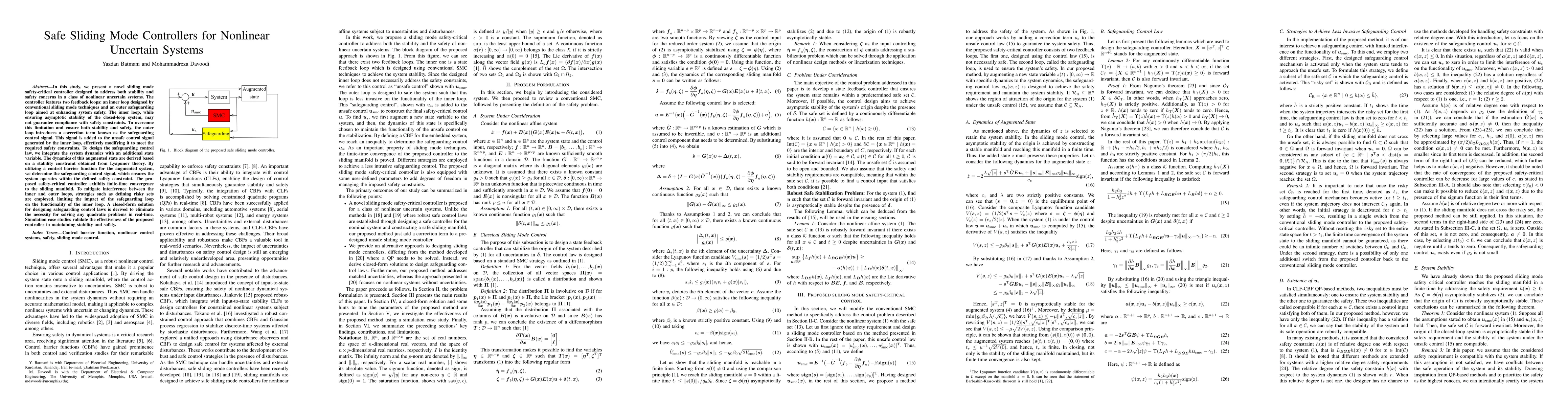 In this study, we present a novel sliding mode safety-critical controller designed to address both stability and safety concerns in a class of nonlinear uncertain systems. The controller features two feedback loops: an inner loop designed by conventional sliding mode techniques and an outer safeguarding loop aimed at enhancing system safety. The inner loop, while ensuring asymptotic stability of the closed-loop system, may not guarantee compliance with safety constraints. To overcome this limitation and ensure both stability and safety, the outer loop introduces a correction term known as the safeguarding control signal. This signal is added to the unsafe control signal generated by the inner loop, effectively modifying it to meet the required safety constraints. To design the safeguarding control law, we integrate the system dynamics with an additional state variable. The dynamics of this augmented state are derived based on a stability constraint obtained from Lyapunov theory. By utilizing a control barrier function for the augmented system, we determine the safeguarding control signal, which ensures the system operates within the defined safety constraint. The proposed safety-critical controller exhibits finite-time convergence to the sliding manifold. To mitigate interference between the inner and outer loops, strategies such as defining risky sets are employed, limiting the impact of the safeguarding loop on the functionality of the inner loop. A closed-form solution for designing safeguarding control laws is derived to eliminate the necessity for solving any quadratic problems in real-time. Simulation case studies validate the effectiveness of the proposed controller in maintaining stability and safety.