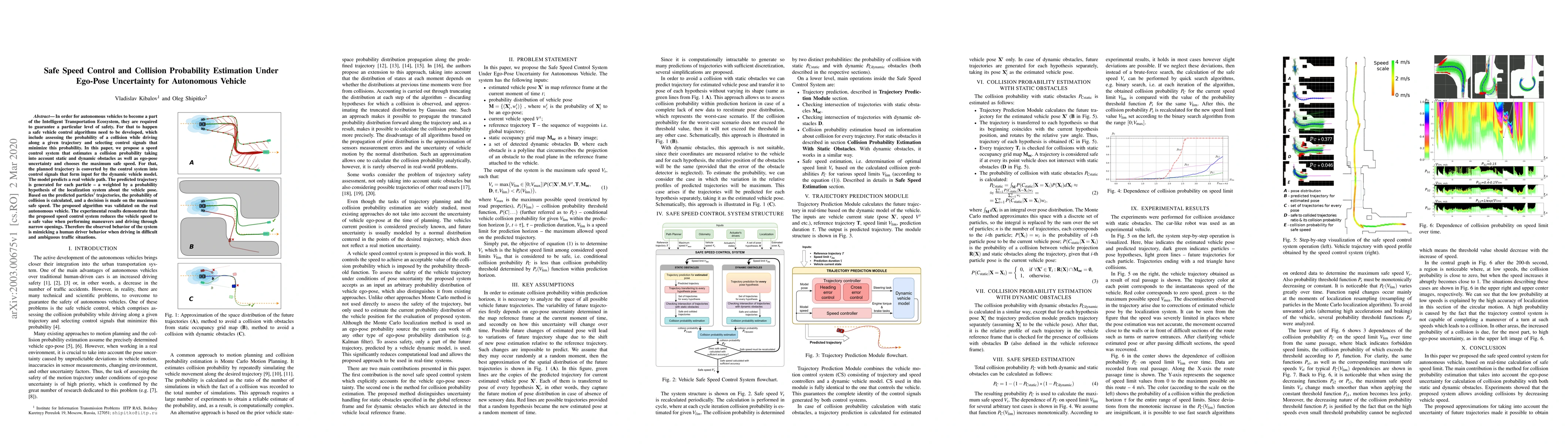 In order for autonomous vehicles to become a part of the Intelligent Transportation Ecosystem, they are required to guarantee a particular level of safety. For that to happen a safe vehicle control algorithms need to be developed, which include assessing the probability of a collision while driving along a given trajectory and selecting control signals that minimize this probability. In this paper, we propose a speed control system that estimates a collision probability taking into account static and dynamic obstacles as well as ego-pose uncertainty and chooses the maximum safe speed. For that, the planned trajectory is converted by the control system into control signals that form input for the dynamic vehicle model. The model predicts a real vehicle path. The predicted trajectory is generated for each particle -- a weighted by a probability hypothesis of the localization system about the vehicle pose. Based on the predicted particles' trajectories, the probability of collision is calculated, and a decision is made on the maximum safe speed. The proposed algorithm was validated on the real autonomous vehicle. The experimental results demonstrate that the proposed speed control system reduces the vehicle speed to a safe value when performing maneuvers and driving through narrow openings. Therefore the observed behavior of the system is mimicking a human driver behavior when driving in difficult and ambiguous traffic situations.