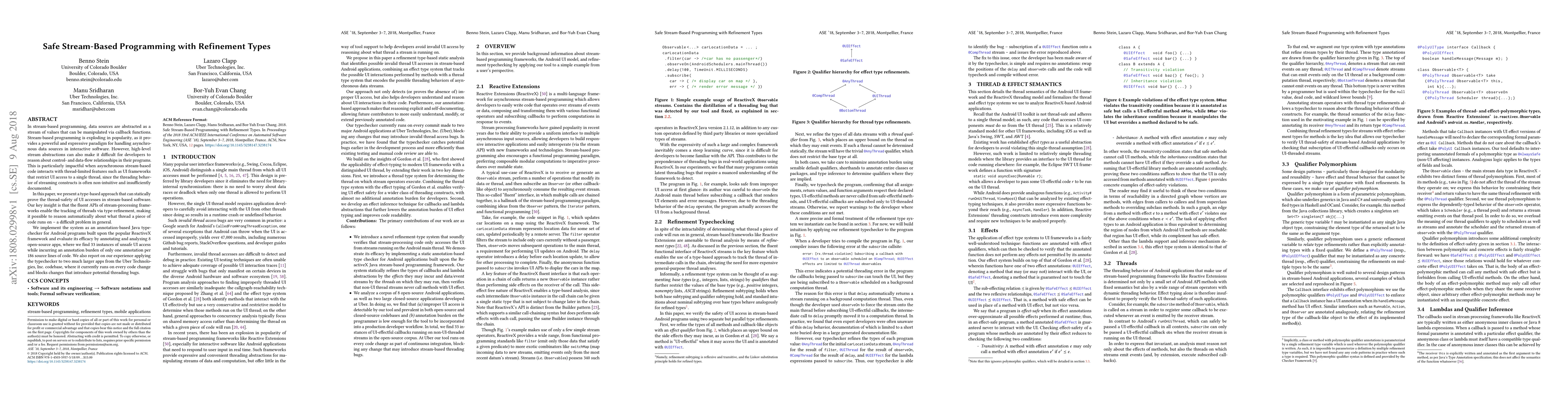 This paper presents a type-based approach to ensure thread-safety in stream-based programming for UI interactions, finding 33 instances of unsafe access in 8 open-source apps with minimal annotation burden.