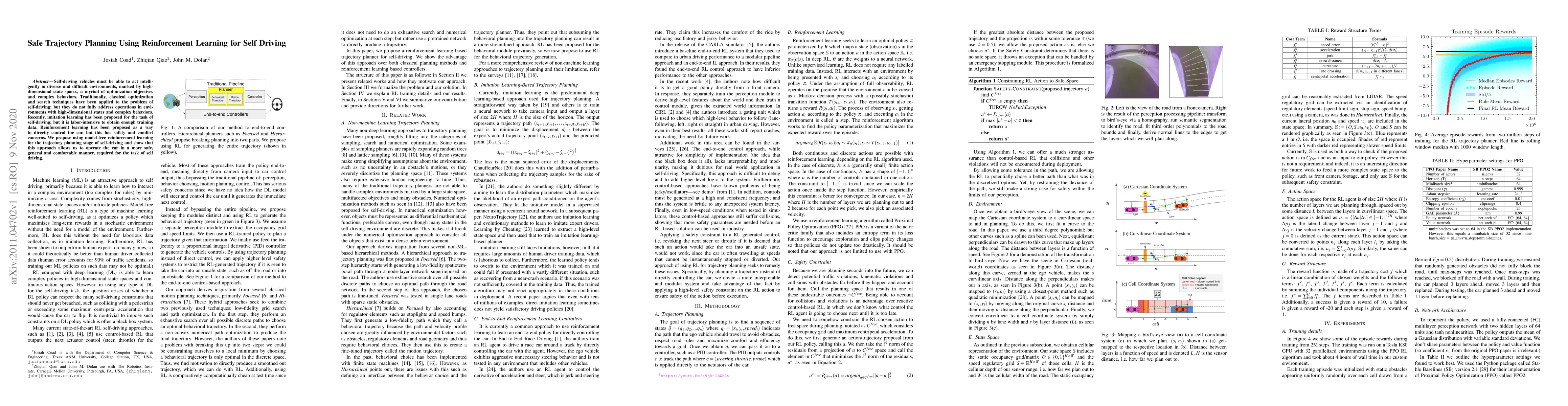 This paper proposes a model-free reinforcement learning approach for safe trajectory planning in self-driving vehicles, addressing the limitations of classical optimization and imitation learning. It demonstrates improved safety, generalizability, and comfort in navigating complex environments.