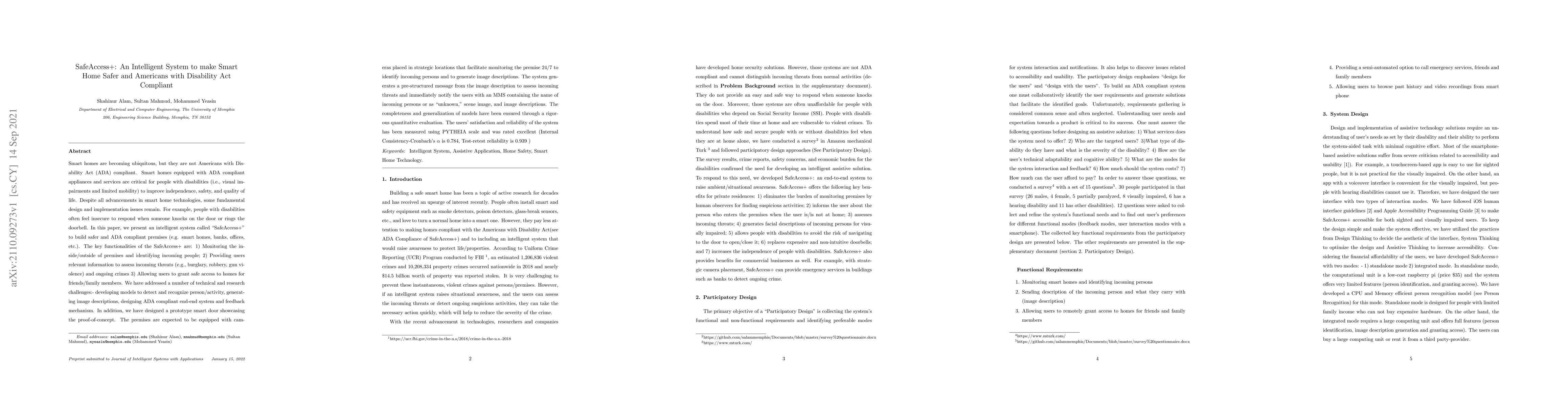 Smart homes are becoming ubiquitous, but they are not Americans with Disability Act (ADA) compliant. Smart homes equipped with ADA compliant appliances and services are critical for people with disabilities (i.e., visual impairments and limited mobility) to improve independence, safety, and quality of life. Despite all advancements in smart home technologies, some fundamental design and implementation issues remain. For example, people with disabilities often feel insecure to respond when someone knocks on the door or rings the doorbell. In this paper, we present an intelligent system called "SafeAccess+" to build safer and ADA compliant premises (e.g. smart homes, offices). The key functionalities of the SafeAccess+ are: 1) Monitoring the inside/outside of premises and identifying incoming people; 2) Providing users relevant information to assess incoming threats (e.g., burglary, robbery) and ongoing crimes 3) Allowing users to grant safe access to homes for friends/family members. We have addressed several technical and research challenges: - developing models to detect and recognize person/activity, generating image descriptions, designing ADA compliant end-end system. In addition, we have designed a prototype smart door showcasing the proof-of-concept. The premises are expected to be equipped with cameras placed in strategic locations that facilitate monitoring the premise 24/7 to identify incoming persons and to generate image descriptions. The system generates a pre-structured message from the image description to assess incoming threats and immediately notify the users. The completeness and generalization of models have been ensured through a rigorous quantitative evaluation. The users' satisfaction and reliability of the system has been measured using PYTHEIA scale and was rated excellent (Internal Consistency-Cronbach's alpha is 0.784, Test-retest reliability is 0.939 )