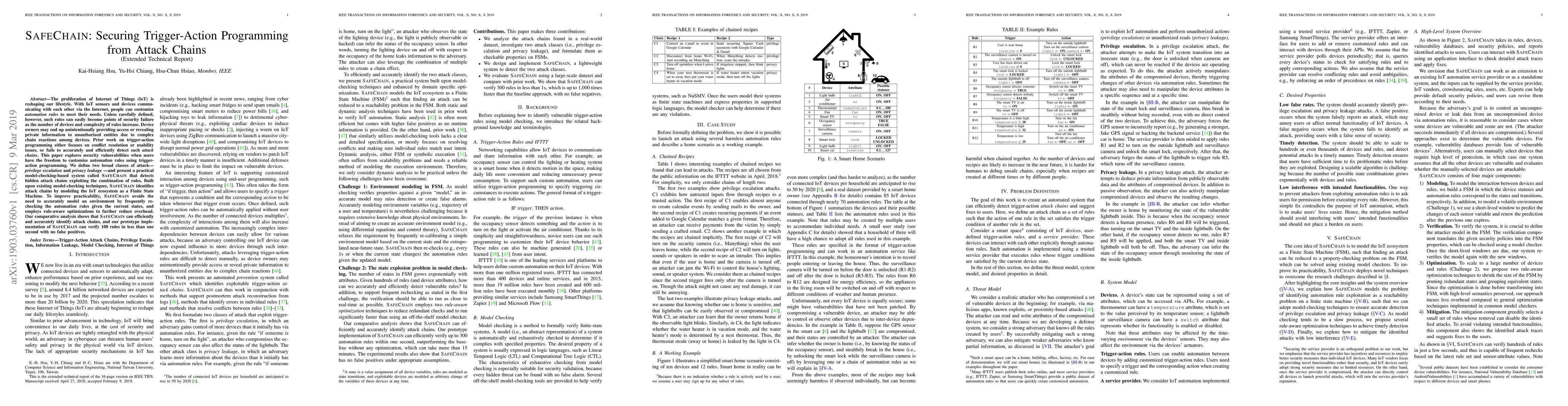 The proliferation of Internet of Things (IoT) is reshaping our lifestyle. With IoT sensors and devices communicating with each other via the Internet, people can customize automation rules to meet their needs. Unless carefully defined, however, such rules can easily become points of security failure as the number of devices and complexity of rules increase. Device owners may end up unintentionally providing access or revealing private information to unauthorized entities due to complex chain reactions among devices. Prior work on trigger-action programming either focuses on conflict resolution or usability issues, or fails to accurately and efficiently detect such attack chains. This paper explores security vulnerabilities when users have the freedom to customize automation rules using trigger-action programming. We define two broad classes of attack--privilege escalation and privacy leakage--and present a practical model-checking-based system called SAFECHAIN that detects hidden attack chains exploiting the combination of rules. Built upon existing model-checking techniques, SAFECHAIN identifies attack chains by modeling the IoT ecosystem as a Finite State Machine. To improve practicability, SAFECHAIN avoids the need to accurately model an environment by frequently re-checking the automation rules given the current states, and employs rule-aware optimizations to further reduce overhead. Our comparative analysis shows that SAFECHAIN can efficiently and accurately identify attack chains, and our prototype implementation of SAFECHAIN can verify 100 rules in less than one second with no false positives.