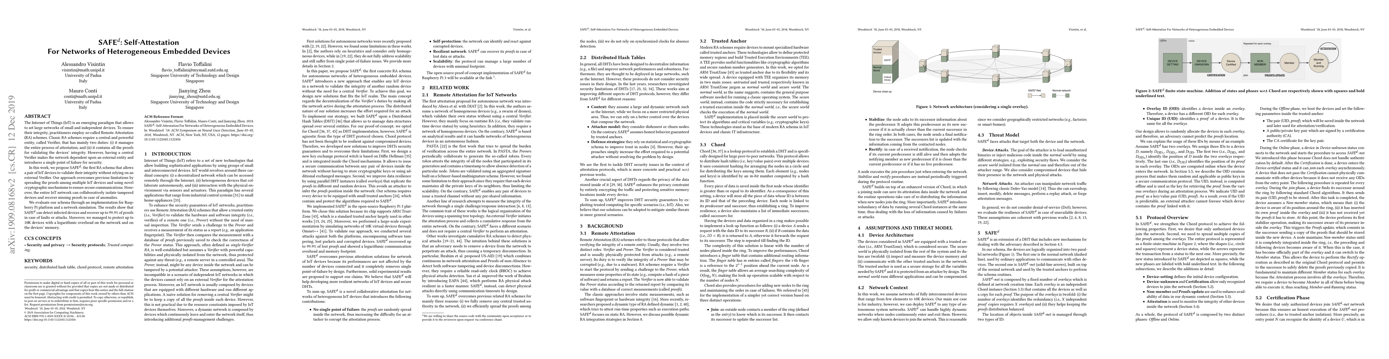 SAFE^d proposes a decentralized Remote Attestation scheme for IoT networks, enabling devices to self-validate integrity without a central Verifier, thus mitigating single points of failure. The approach spreads proofs and uses cryptographic mechanisms to ensure secure communications, allowing the network to isolate tampered devices and recover missing proofs collaboratively.