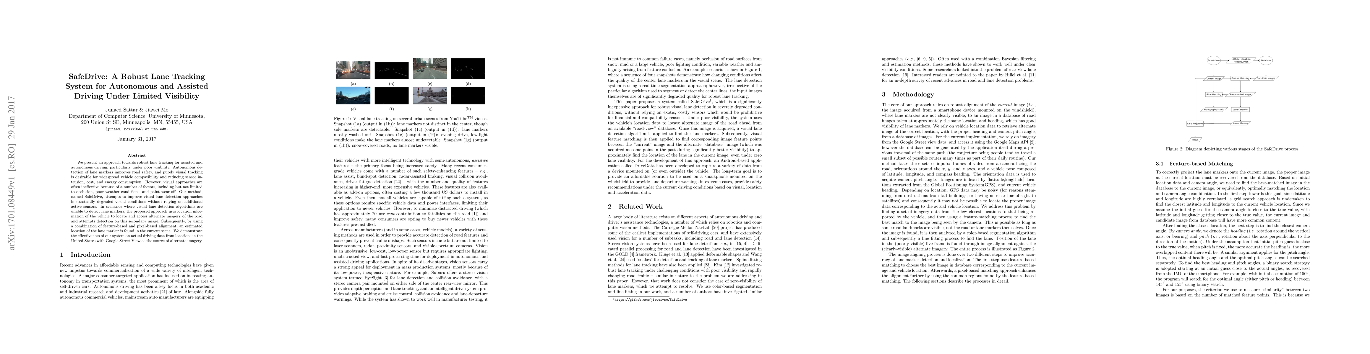 SafeDrive enhances lane tracking for autonomous and assisted driving, especially under poor visibility, by improving visual detection methods without extra sensors. It uses location data and alternate imagery to locate lane markers when visual tracking fails, combining feature-based and pixel-based alignment for accurate lane detection.