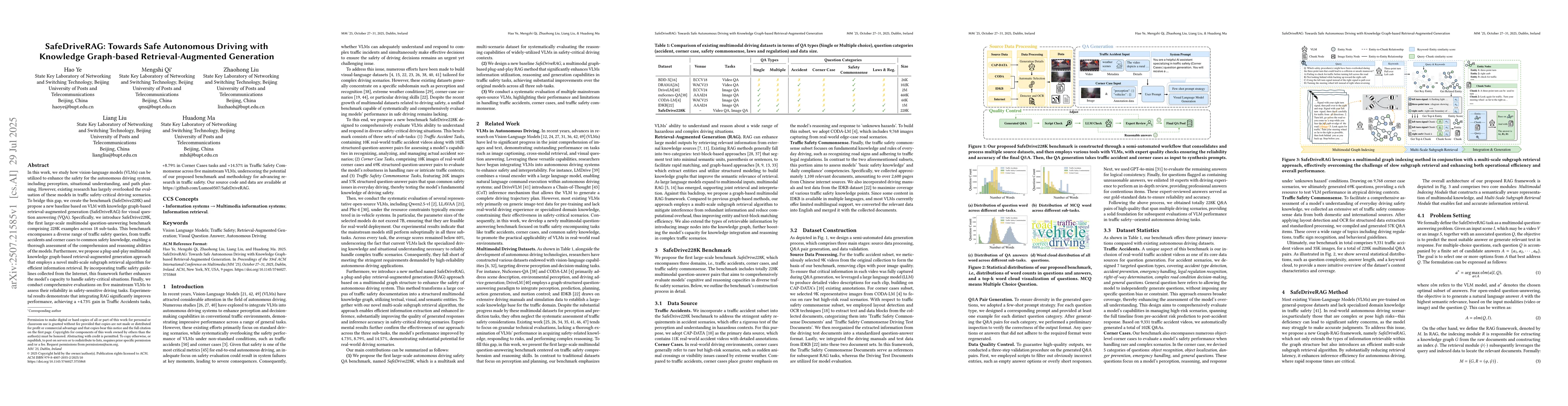 In this work, we study how vision-language models (VLMs) can be utilized to enhance the safety for the autonomous driving system, including perception, situational understanding, and path planning. However, existing research has largely overlooked the evaluation of these models in traffic safety-critical driving scenarios. To bridge this gap, we create the benchmark (SafeDrive228K) and propose a new baseline based on VLM with knowledge graph-based retrieval-augmented generation (SafeDriveRAG) for visual question answering (VQA). Specifically, we introduce SafeDrive228K, the first large-scale multimodal question-answering benchmark comprising 228K examples across 18 sub-tasks. This benchmark encompasses a diverse range of traffic safety queries, from traffic accidents and corner cases to common safety knowledge, enabling a thorough assessment of the comprehension and reasoning abilities of the models. Furthermore, we propose a plug-and-play multimodal knowledge graph-based retrieval-augmented generation approach that employs a novel multi-scale subgraph retrieval algorithm for efficient information retrieval. By incorporating traffic safety guidelines collected from the Internet, this framework further enhances the model's capacity to handle safety-critical situations. Finally, we conduct comprehensive evaluations on five mainstream VLMs to assess their reliability in safety-sensitive driving tasks. Experimental results demonstrate that integrating RAG significantly improves performance, achieving a +4.73% gain in Traffic Accidents tasks, +8.79% in Corner Cases tasks and +14.57% in Traffic Safety Commonsense across five mainstream VLMs, underscoring the potential of our proposed benchmark and methodology for advancing research in traffic safety. Our source code and data are available at https://github.com/Lumos0507/SafeDriveRAG.