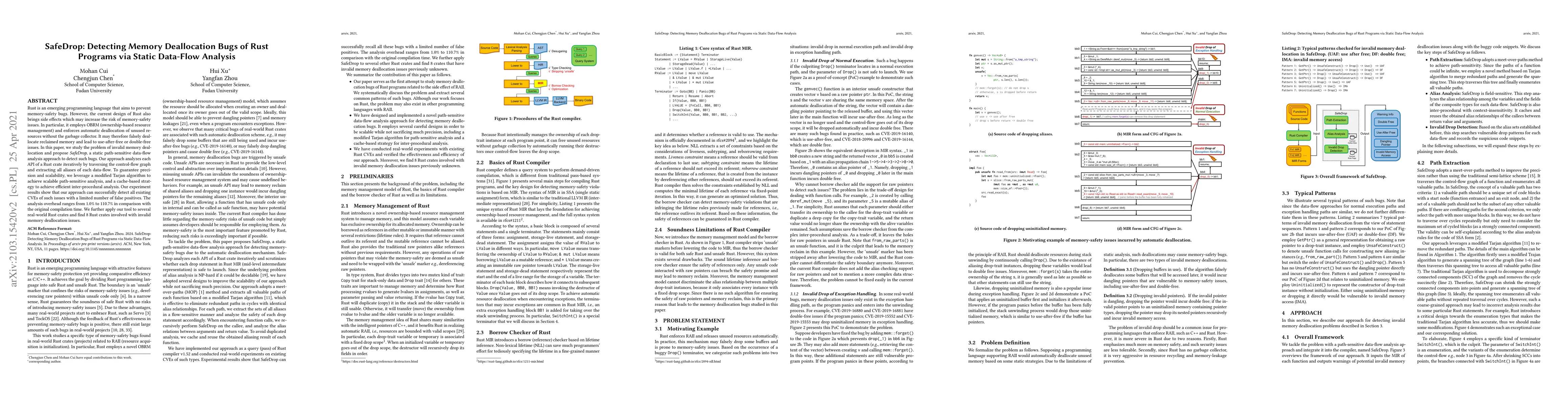 SafeDrop is a static data-flow analysis method designed to detect memory deallocation bugs in Rust programs, particularly use-after-free and double-free issues. It leverages a modified Tarjan algorithm and a cache-based strategy for scalable and efficient analysis, successfully identifying existing CVEs with minimal false positives.
