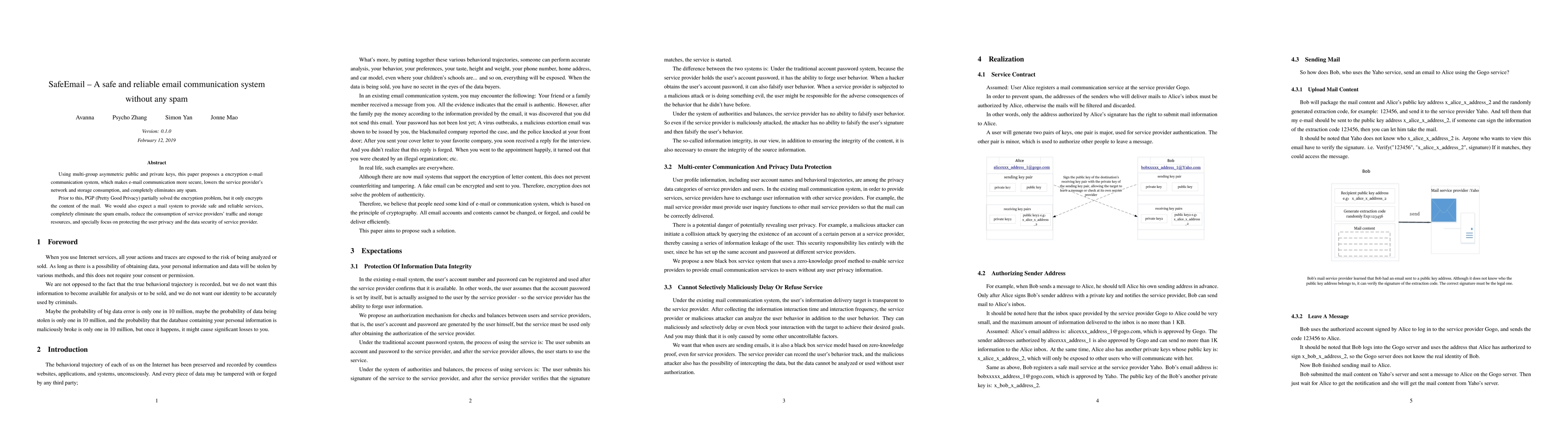 Using multi group asymmetric public and private keys, this paper proposes a encryption email communication system, which makes email communication more secure, lowers the service provider\'s network and storage consumption, and completely eliminates any spam. Prior to this, PGP (Pretty Good Privacy) partially solved the encryption problem, but it only encrypts the content of the mail. We would also expect a mail system to provide safe and reliable services, completely eliminate the spam emails, reduce the consumption of service provider\'s traffic and storage resources, and specially focus on protecting the user privacy and the data security of service provider.