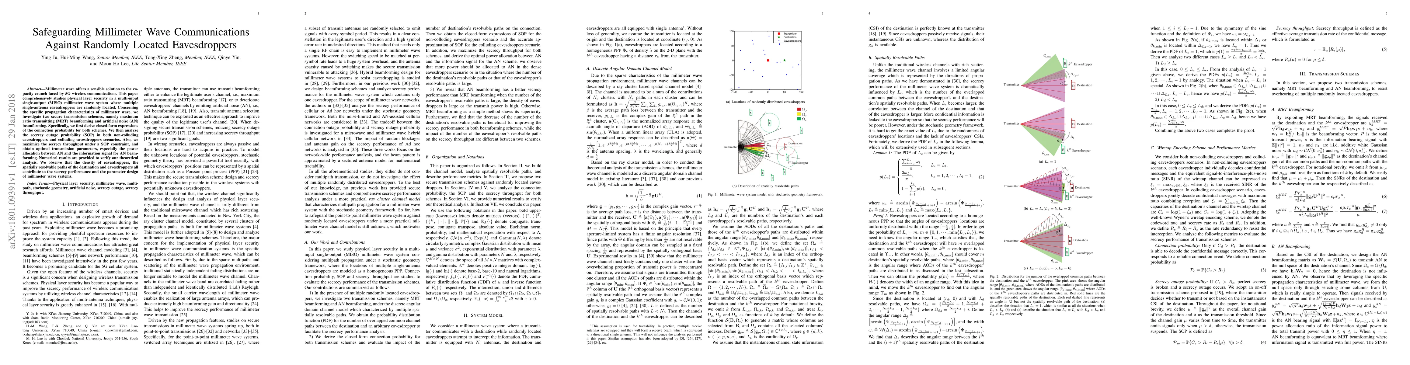 This paper investigates physical layer security in millimeter wave communications, focusing on MISO systems with randomly located eavesdroppers. It evaluates two secure transmission schemes, deriving expressions for connection probability and analyzing secrecy outage probability, while optimizing secrecy throughput under a SOP constraint. Numerical results confirm the impact of eavesdropper density and spatial paths on system security.