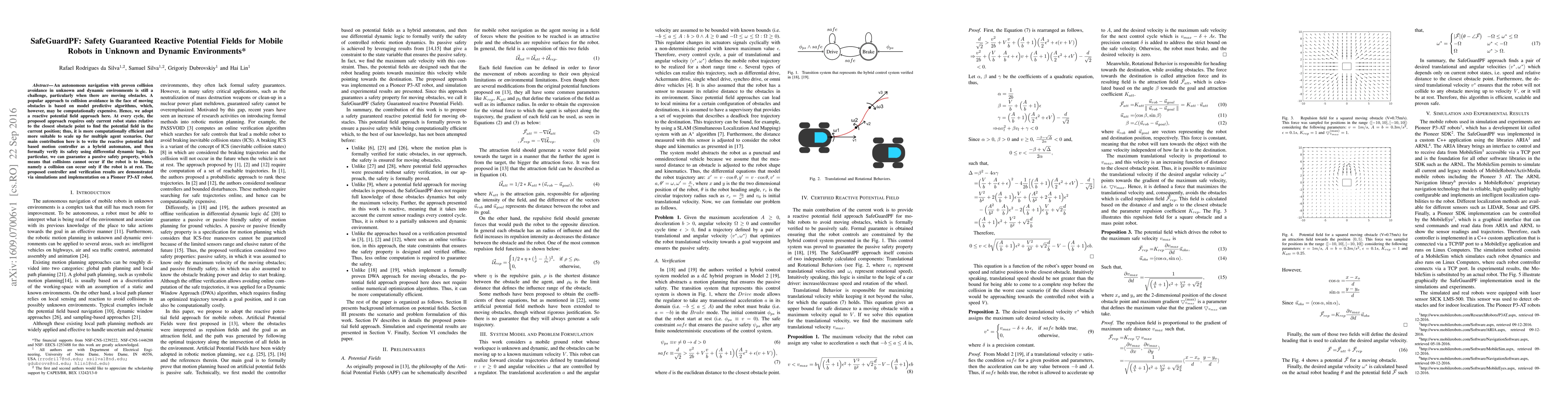 This paper proposes SafeGuardPF, a reactive potential field approach for autonomous navigation with collision avoidance in unknown and dynamic environments. It uses a hybrid automaton model to formally verify safety, ensuring that collisions can only occur if the robot is stationary, and demonstrates the method through simulations and a Pioneer P3-AT robot.