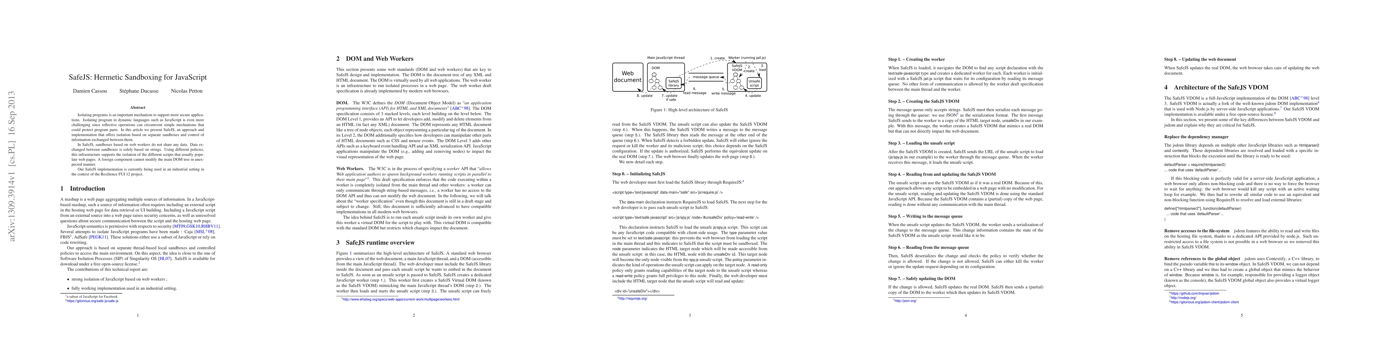 SafeJS provides a hermetic sandboxing solution for JavaScript using web workers to isolate scripts, ensuring data exchange occurs only through string representations, thereby preventing unexpected DOM modifications. This approach is currently deployed in an industrial setting for enhancing application security.